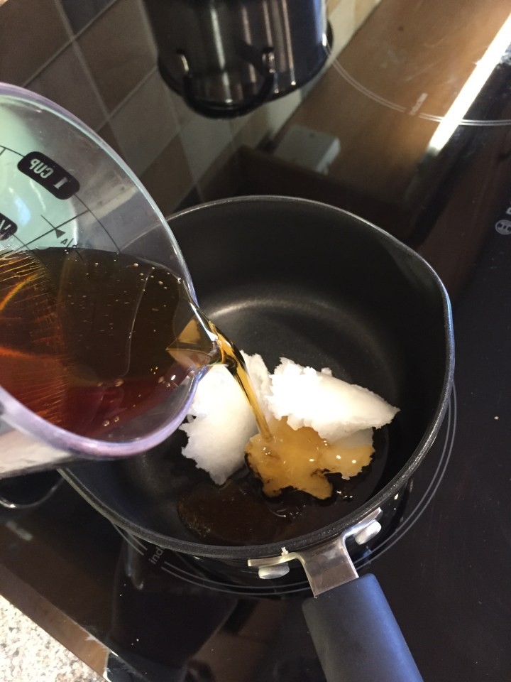 In a pan put the coconut oil, maple syrup and a teaspoon of cinnamon and melt together on a low heat