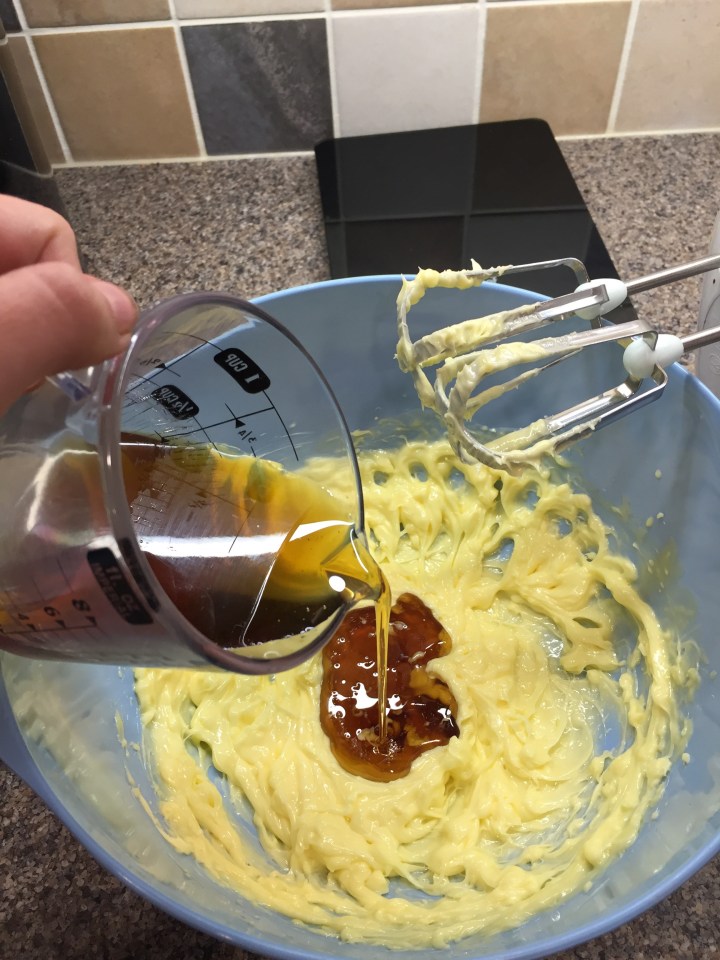 Warm the butter until it’s soft. Whisk with an electric whisk then add the maple syrup and whisk again.