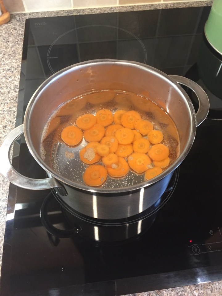 In a pan pop the carrots into cold water and put on to boil