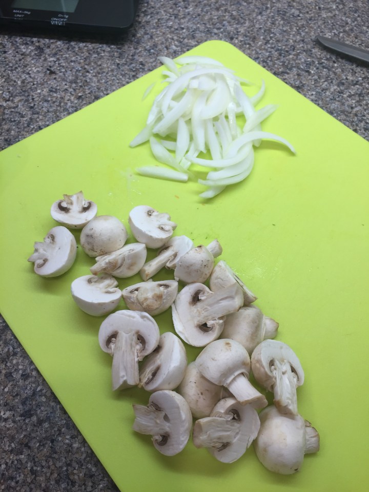 Meanwhile slice the onion and half the mushrooms. The chunkier the veg is the easier it is for baby to pick up!