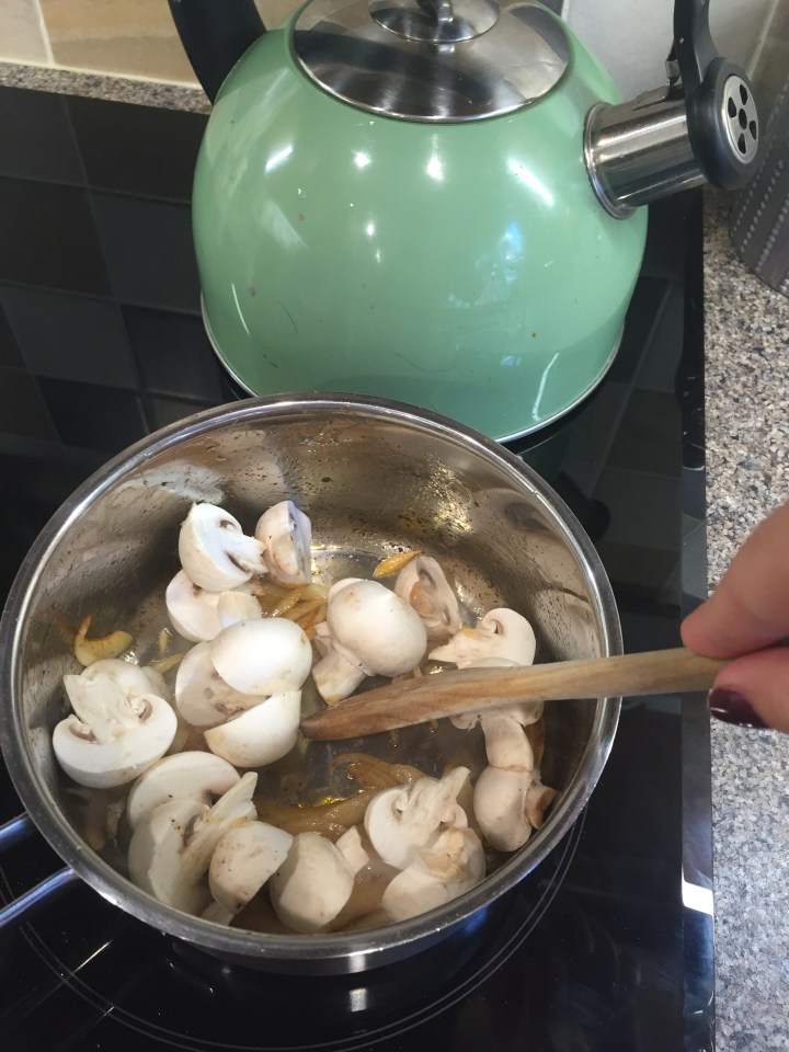 Add the mushrooms and cook for another 3-5mins until they’re soft