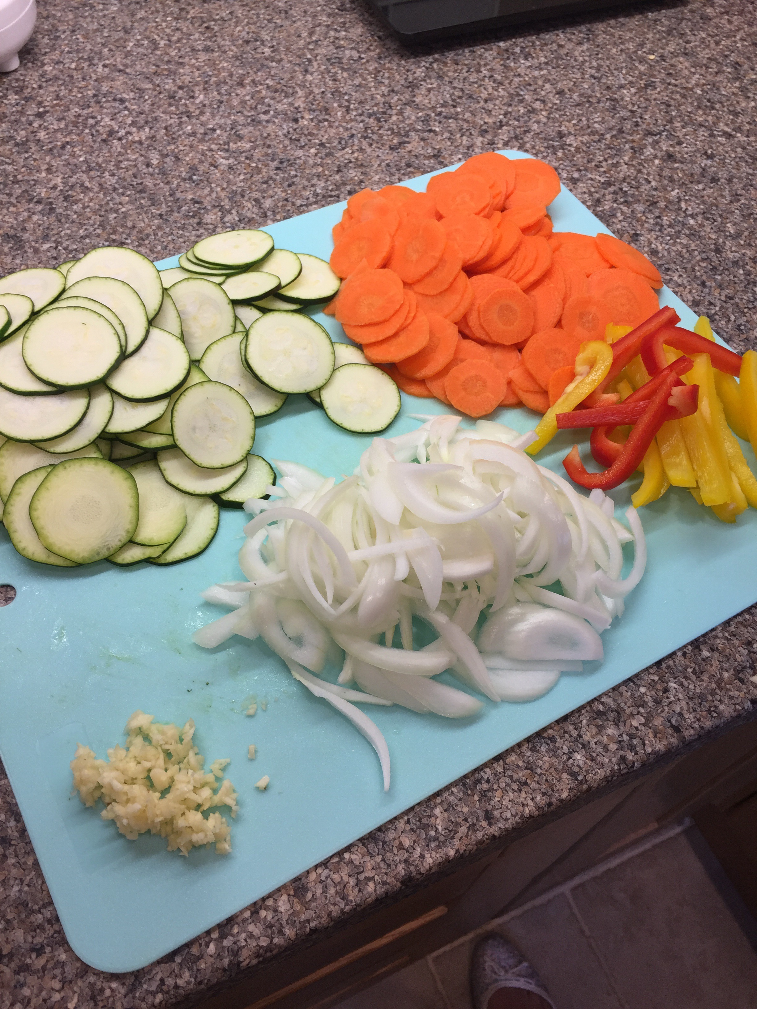 Prep the veg. Thinly slice the carrots, courgettes, pepper and onion. Finely chop the garlic.