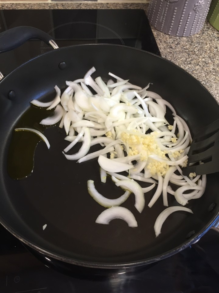 In a deep frying pan heat a tablespoon of oil and cook the onion and garlic on a medium/low heat for 5-6mins until soft