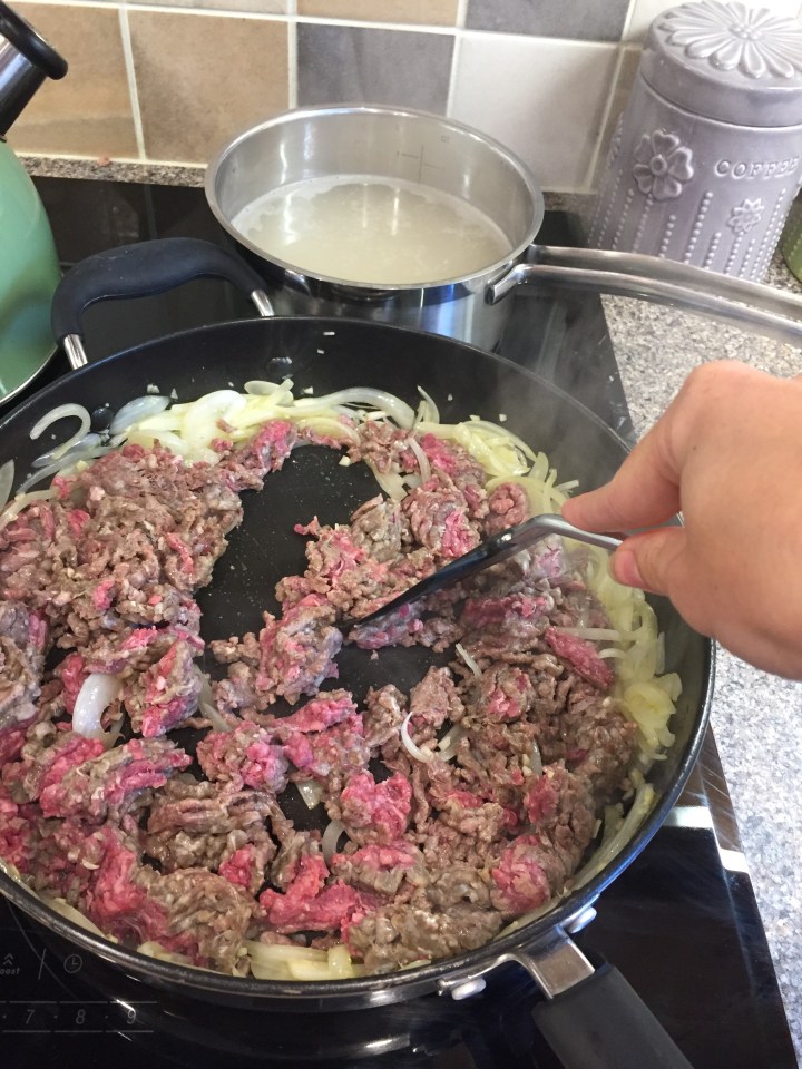 Turn up the heat to medium/high and add the mince. Cook until it’s cooked through and keep breaking it up with a spatula or wooden spoon as you go. If you end up with a lot of excess oil in the pan drain it off at this point.