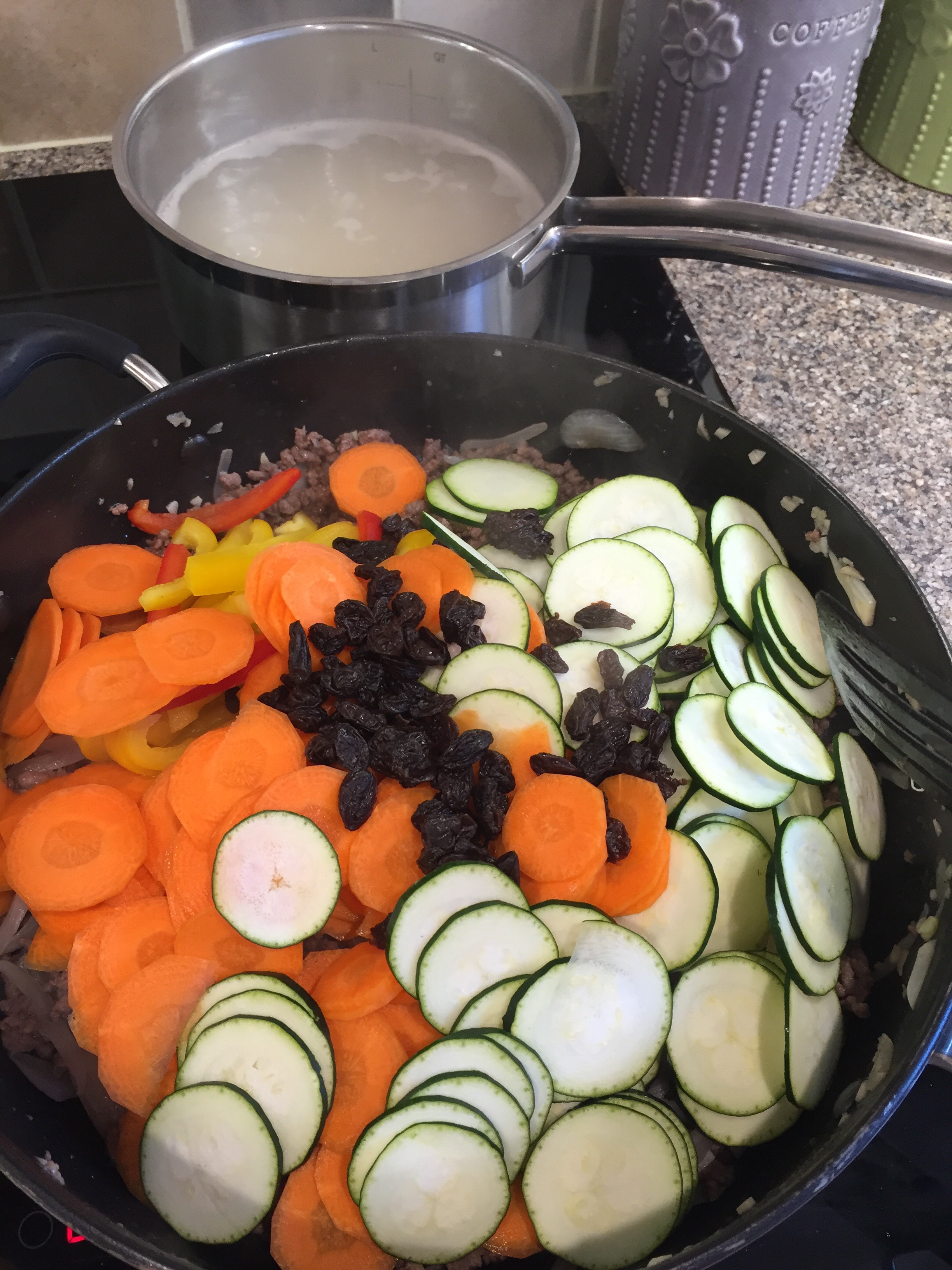 Add the carrots, courgette, pepper and raisins with plenty of black pepper and a little salt. Mix it all together.