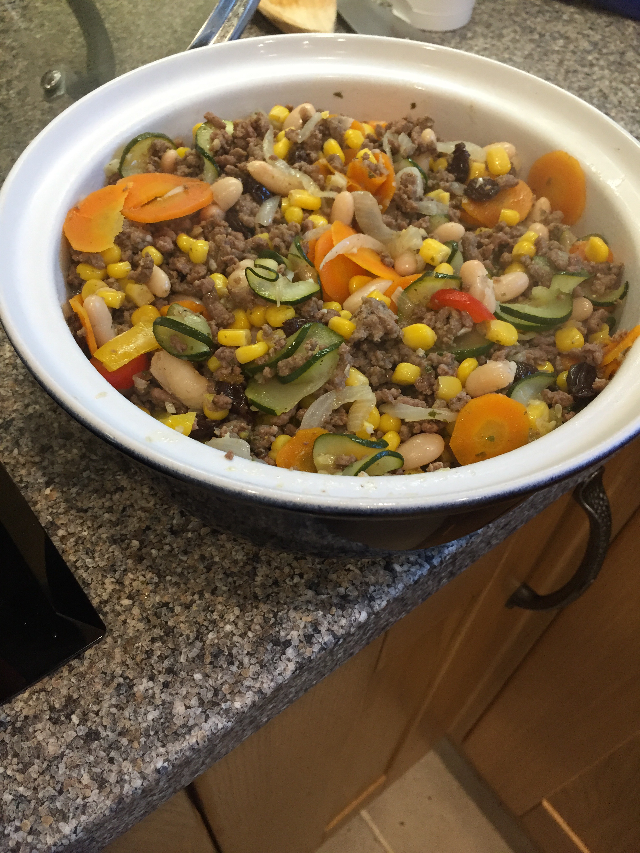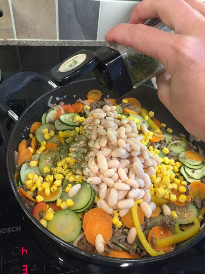 After 20-25mins of cooking the beef and veg add in the sweetcorn, beans and parsley and cook for a further 5mins