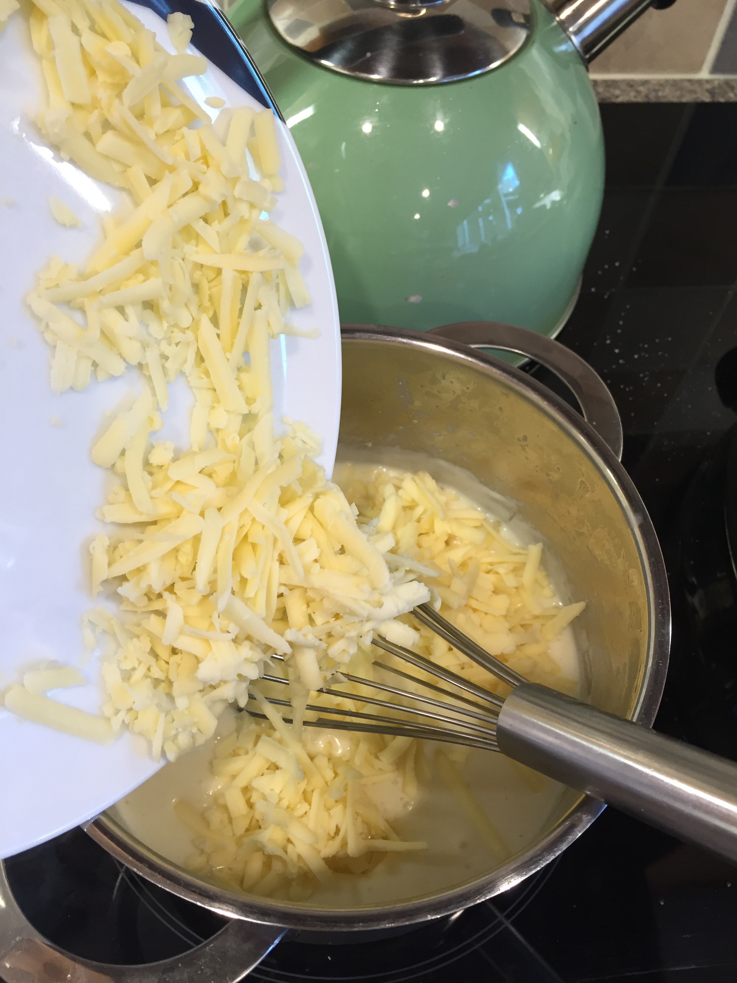 Once the sauce has thickened (having stirred it constantly until it did) add the grated cheese and take it off the heat.