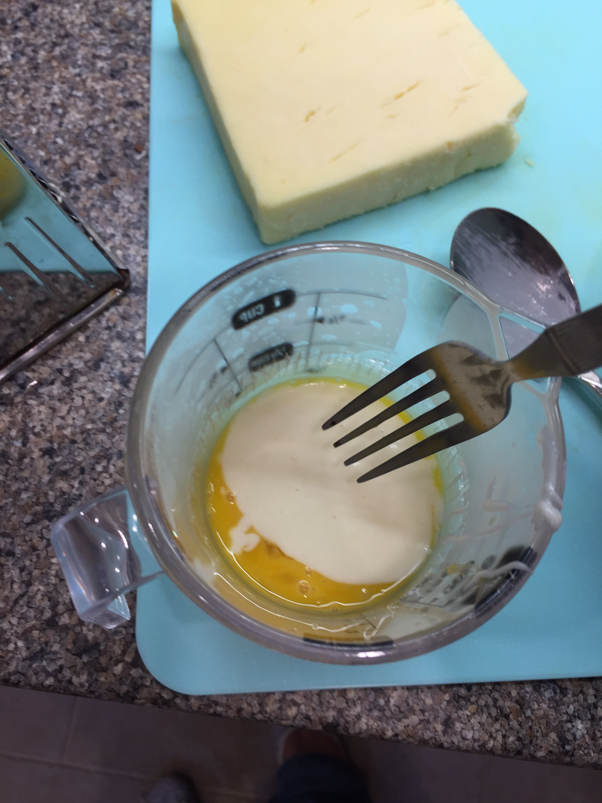 In a small jug or bowl whisk the egg yolks with a fork and add 2-3 tablespoons of the cheese sauce. Mix together then pour back into the main cheese sauce mixture and mix in.
