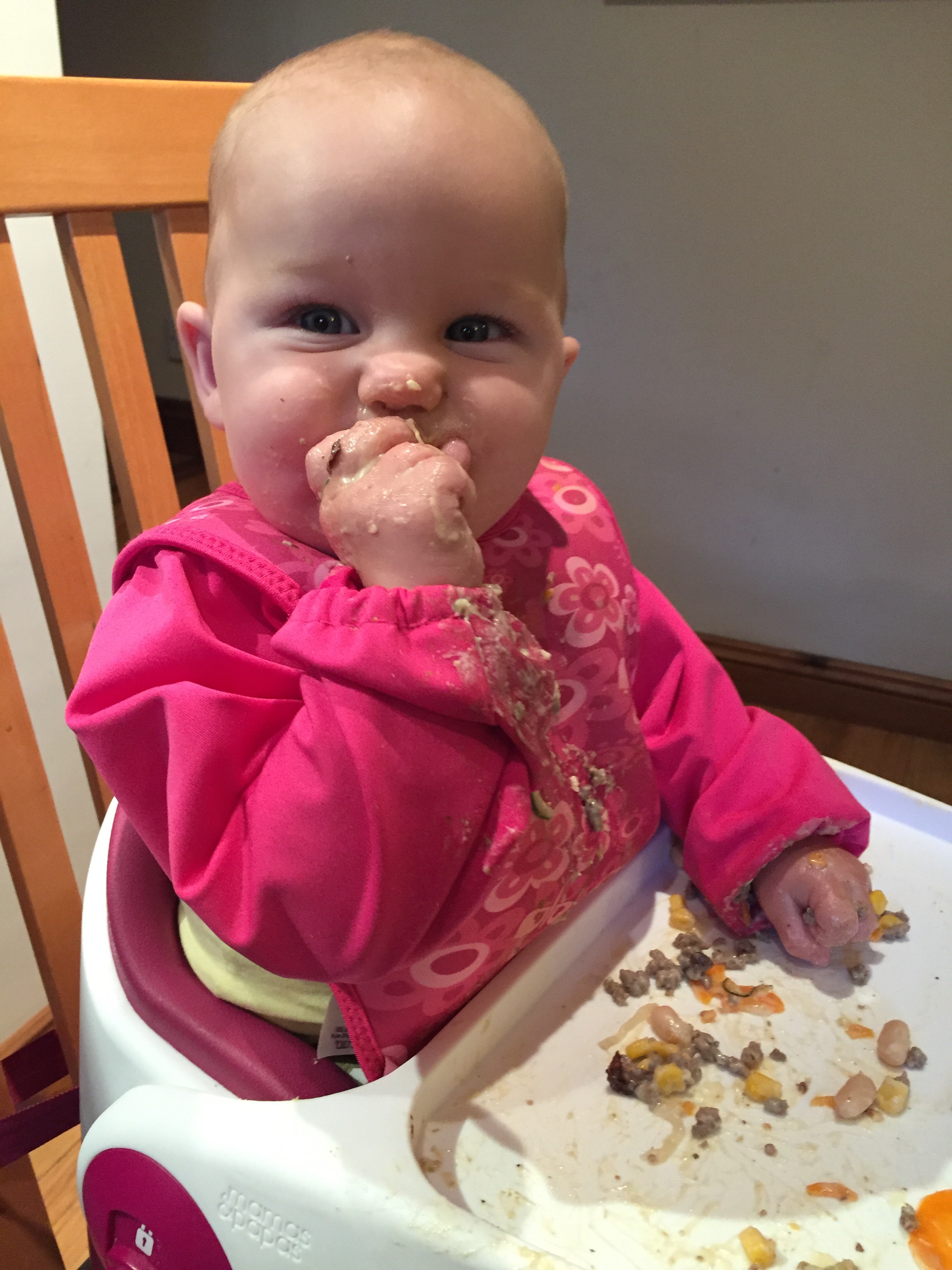 I was pleasantly surprised by how well baby managed this one at only 6 1/2 months old. She scooped it all up in big handfuls and managed to suck it out of her hand really well. Just goes to show that baby led weaning doesn’t have to only be about finger shaped foods!