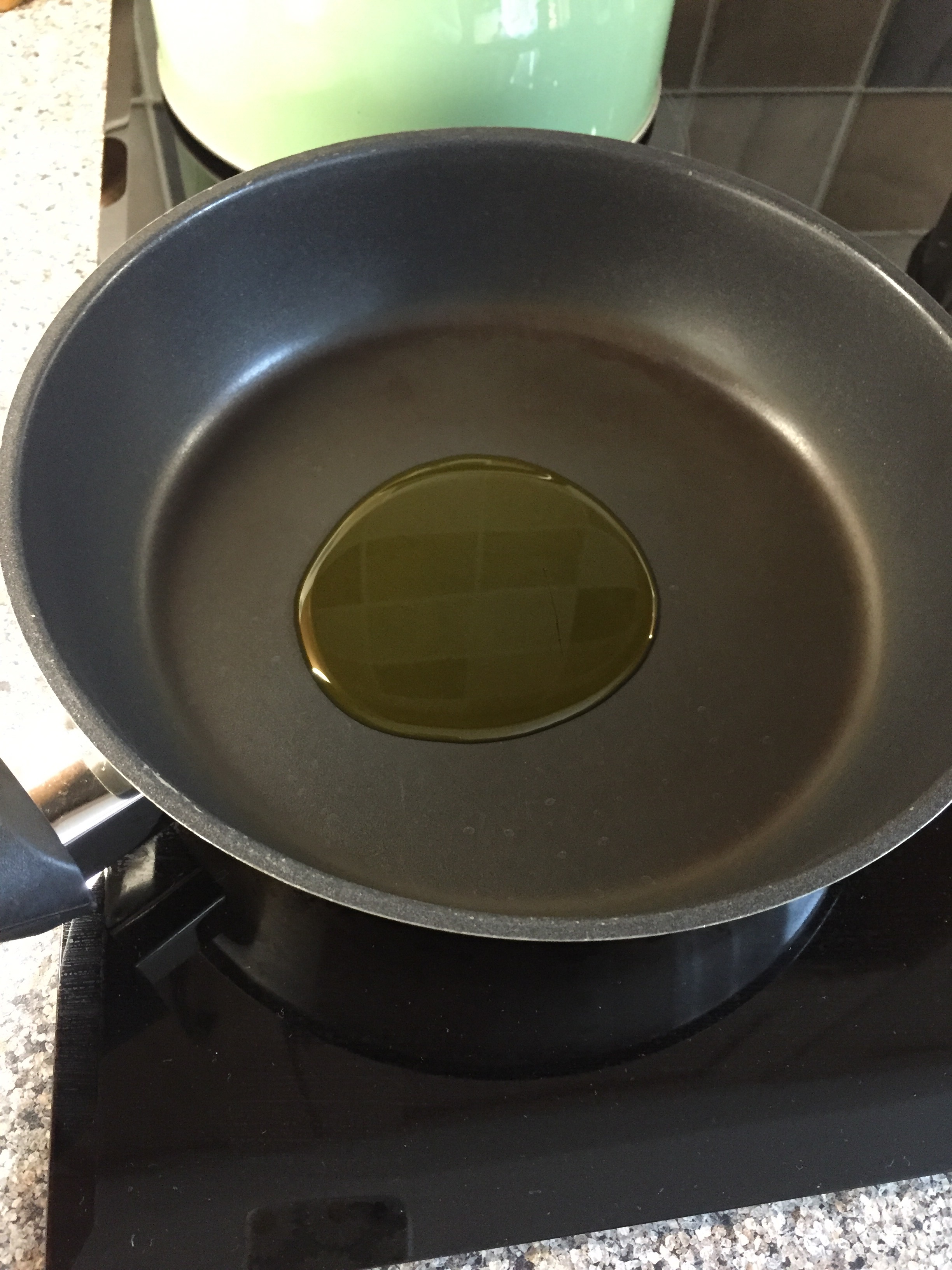 In a frying pan heat the oil (I’m using rapeseed oil but any oil or butter will work)