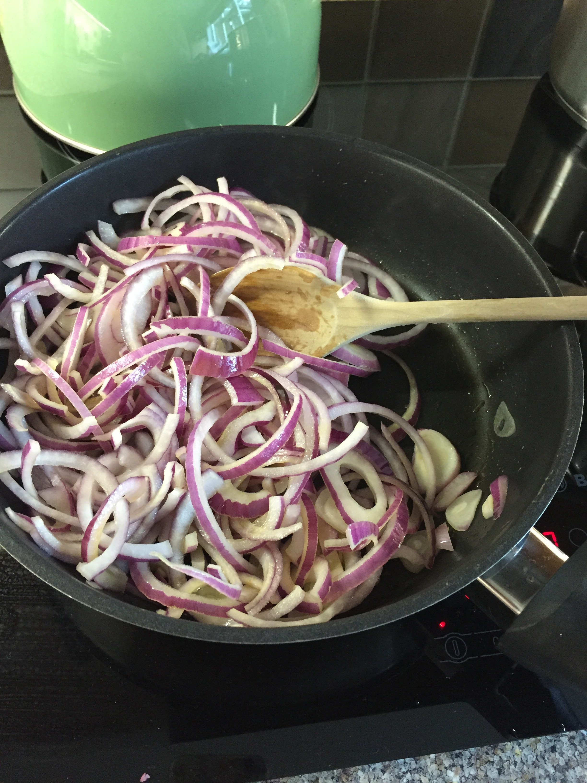 Add the onions and stir to cover with oil. Leave to cook on a low heat for 10-15mins stirring occasionally.