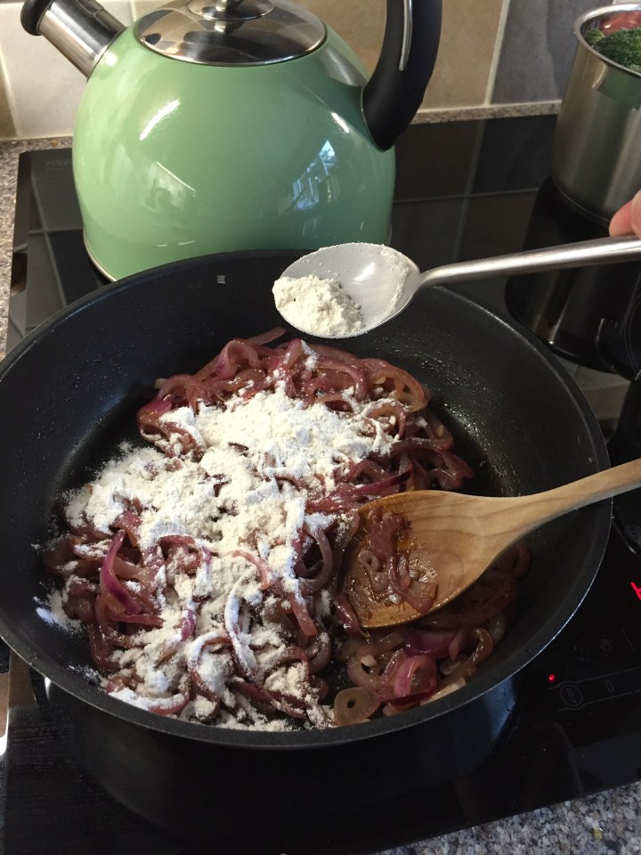 Sprinkle over the flour and mix thoroughly as it cooks through