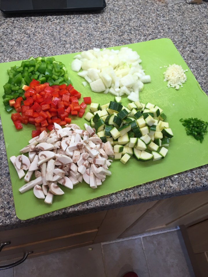 Prepare the veg- finely chop the onion, cut the courgette and peppers into small cubes, finely chop the garlic and green chilli (no seeds), cut the mushrooms into small pieces.