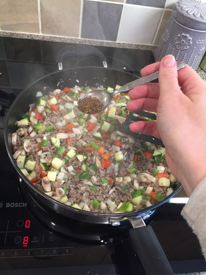 Bring on the spices! Add your cumin seeds, ground coriander, paprika, chilli powder and cook for a further couple of minutes to bring the flavour out.