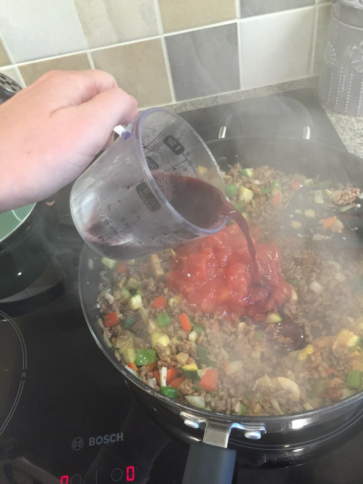 In a large frying pan heat a touch of oil and fry off the mince working it as you go to avoid lumps forming. Once it’s pretty much cooked through drain off and excess oil.