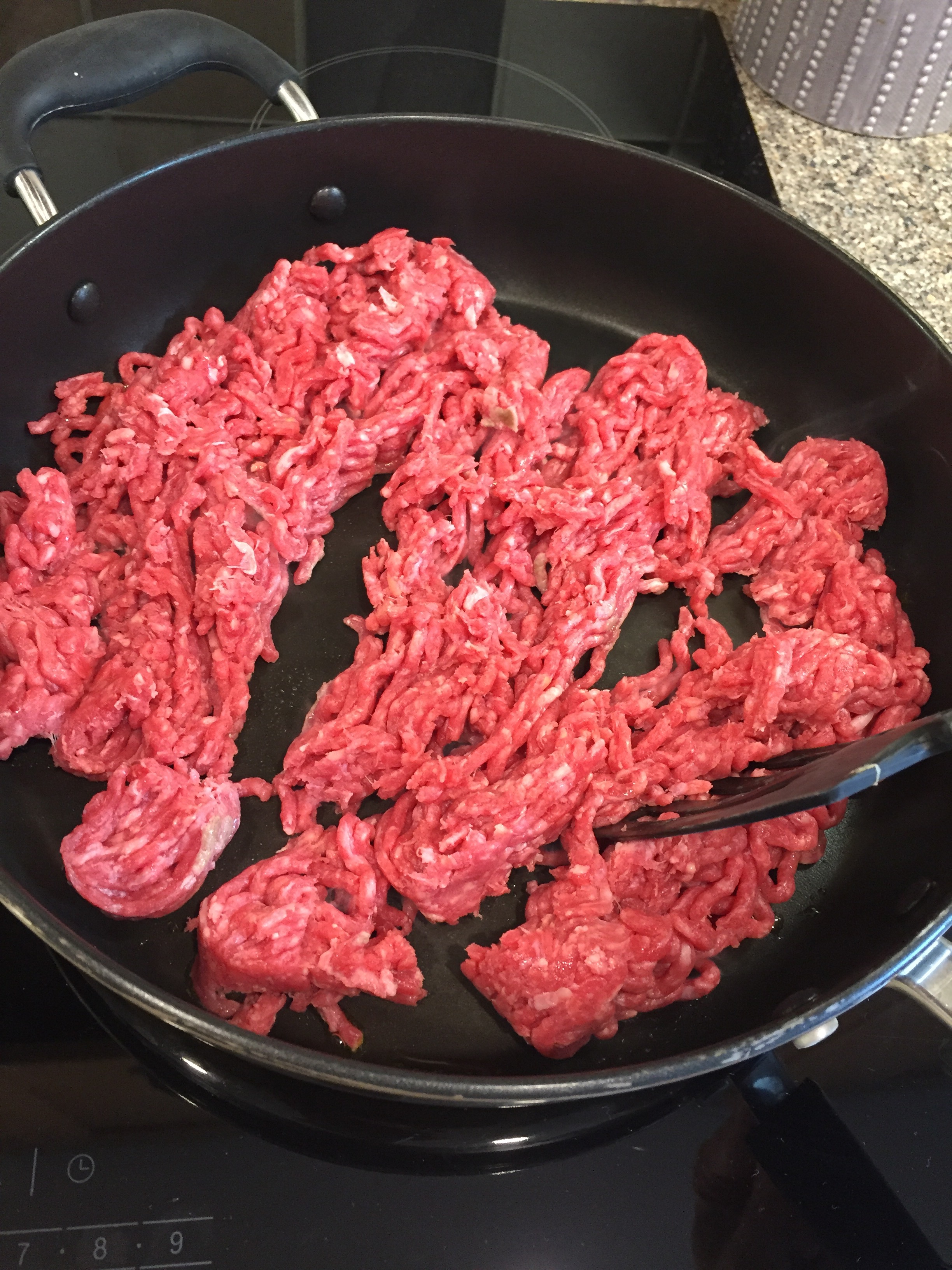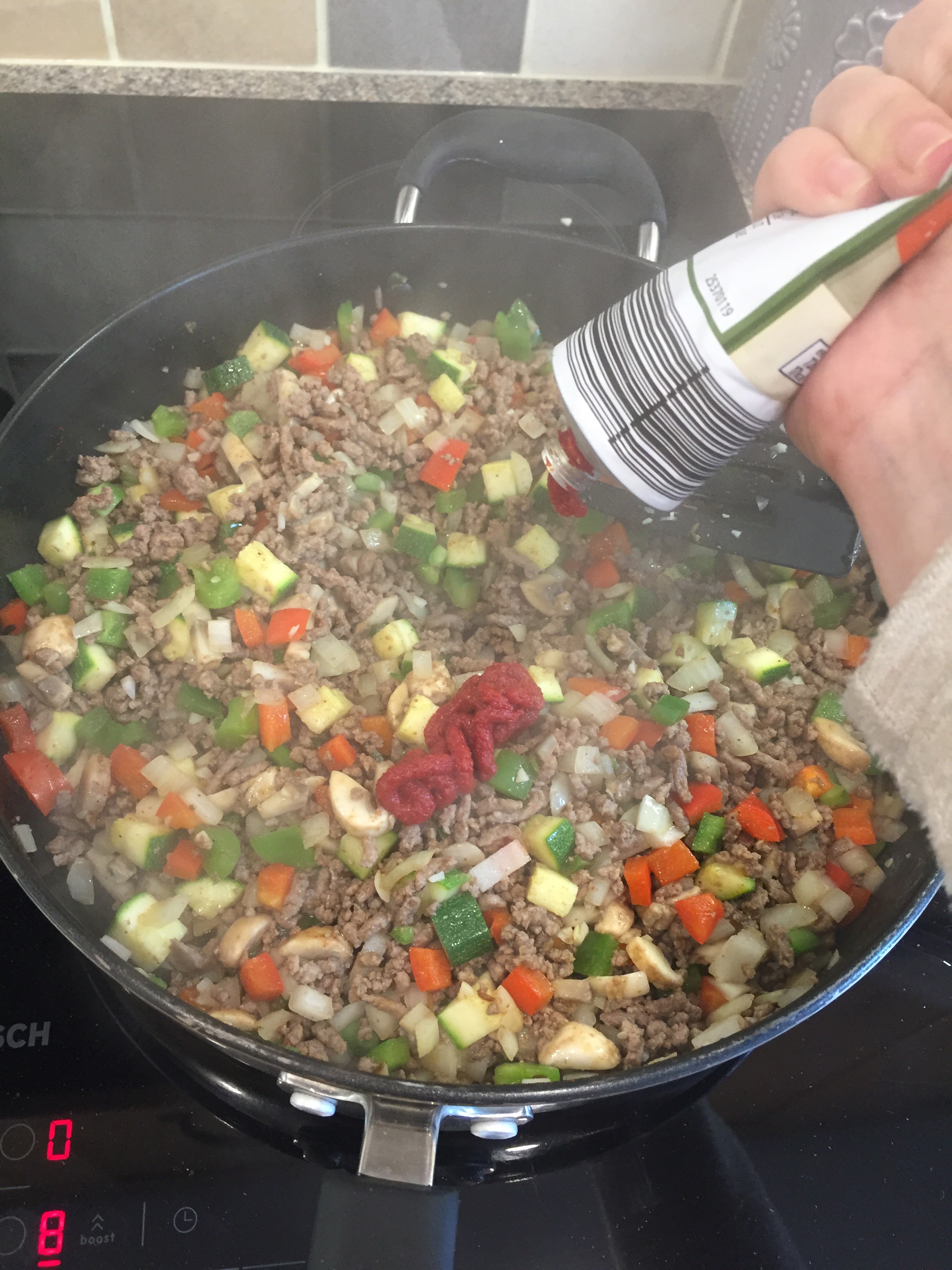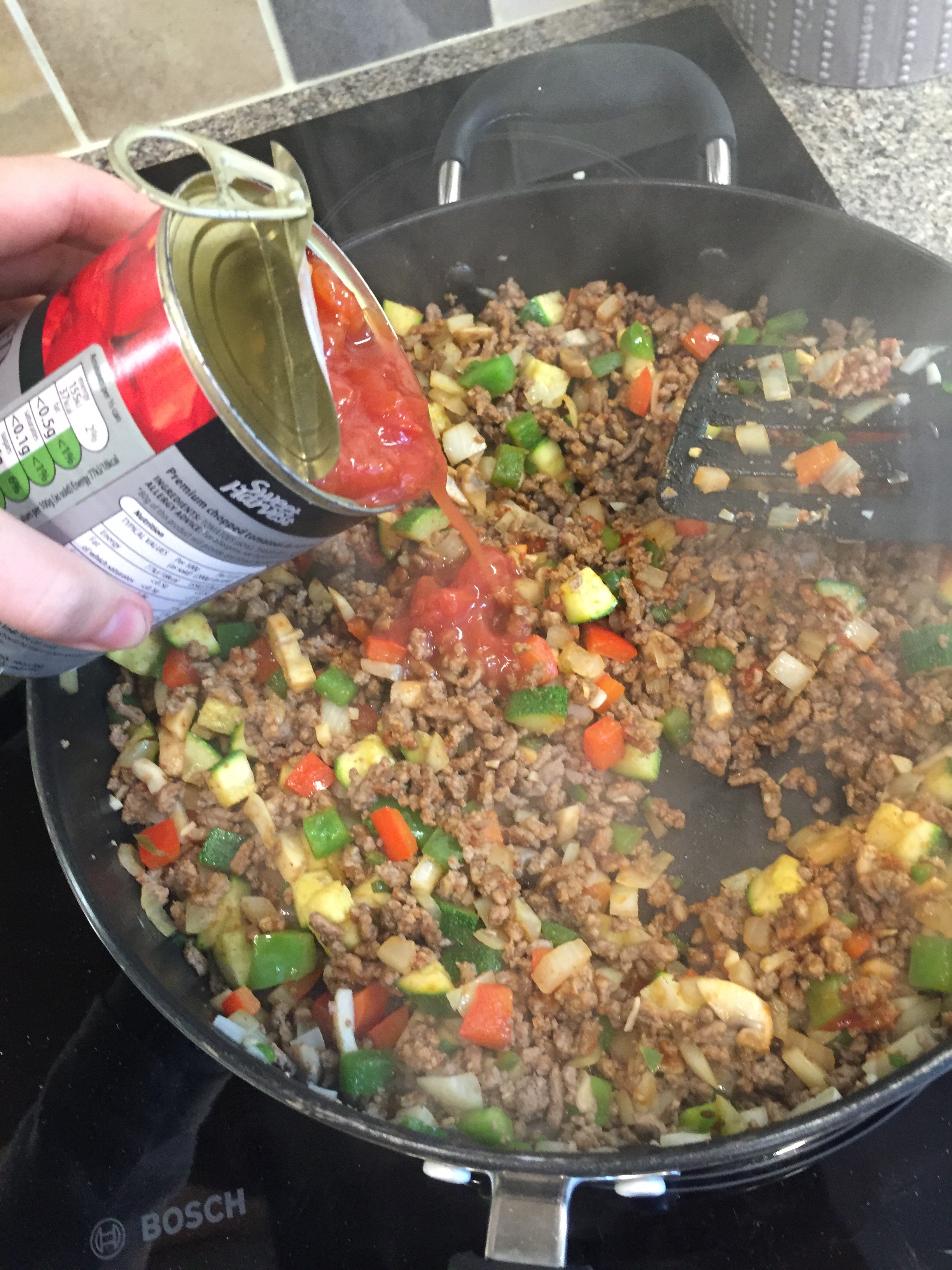 In a large frying pan heat a touch of oil and fry off the mince working it as you go to avoid lumps forming. Once it’s pretty much cooked through drain off and excess oil.
