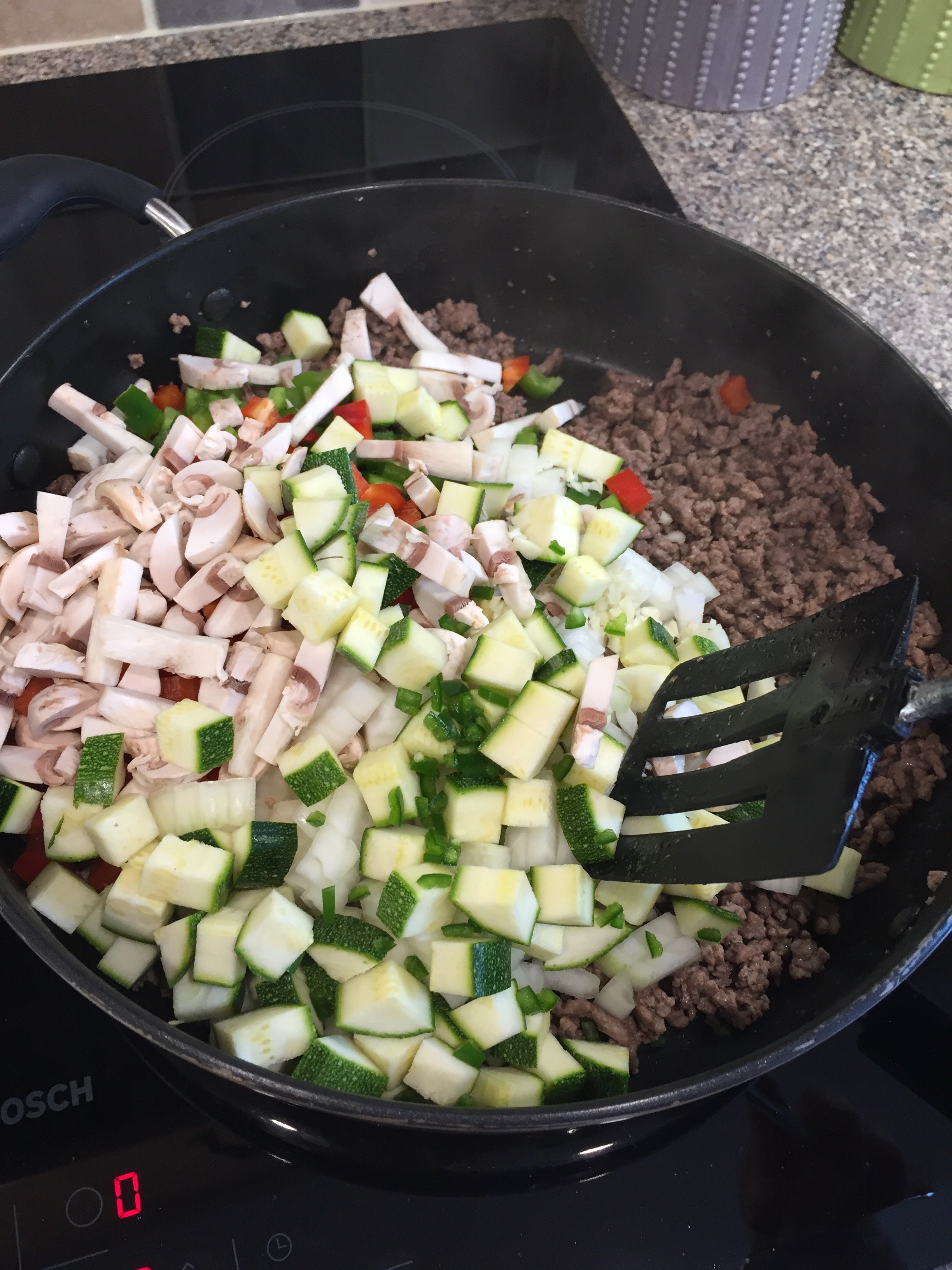 Prepare the veg- finely chop the onion, cut the courgette and peppers into small cubes, finely chop the garlic and green chilli (no seeds), cut the mushrooms into small pieces.