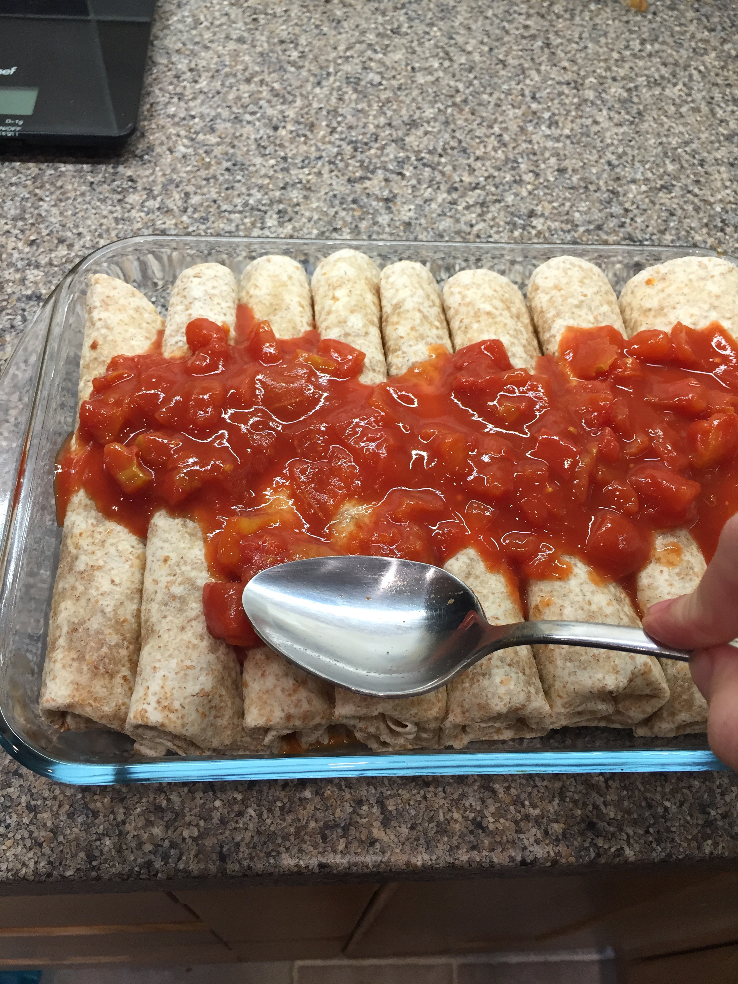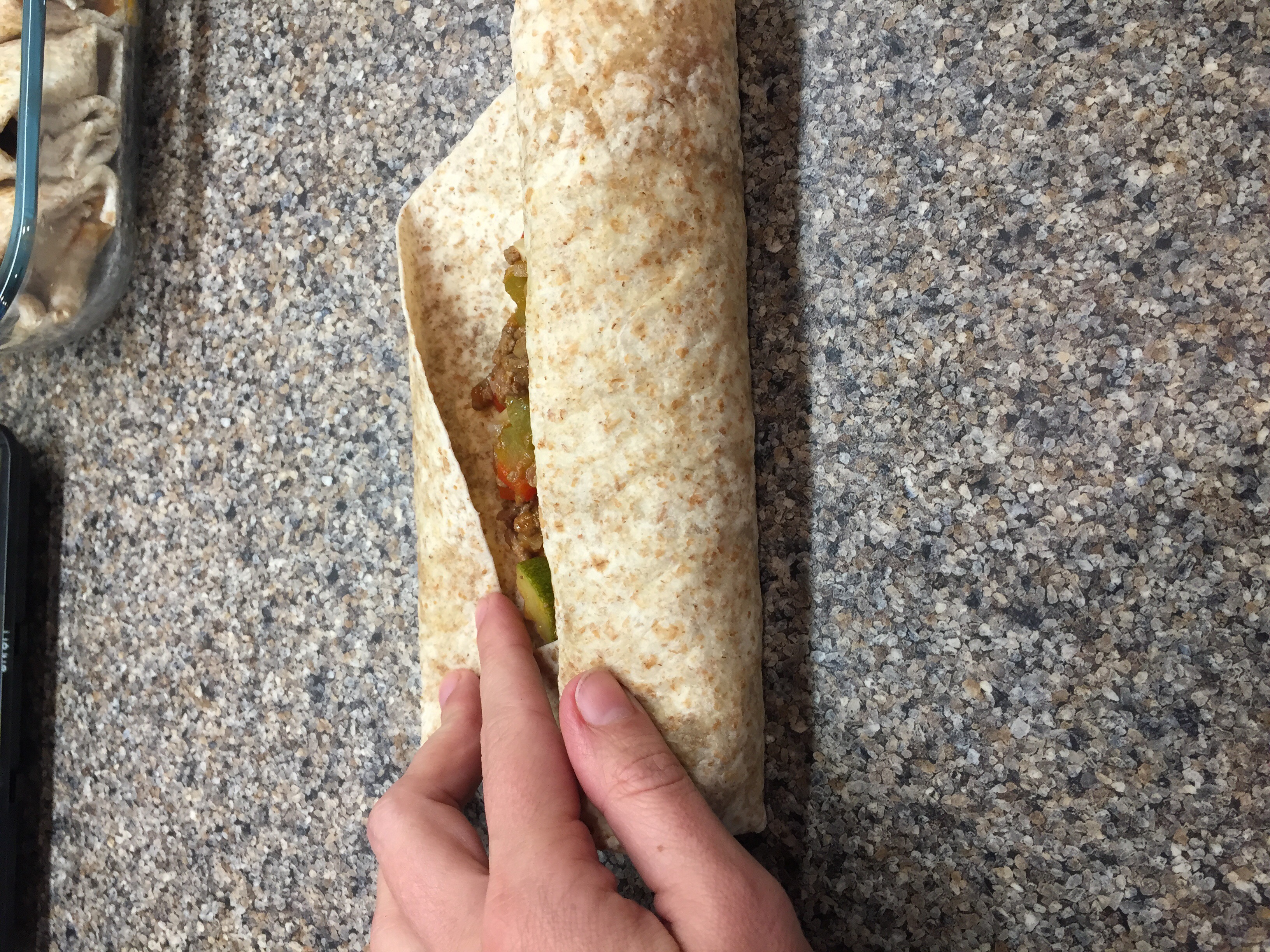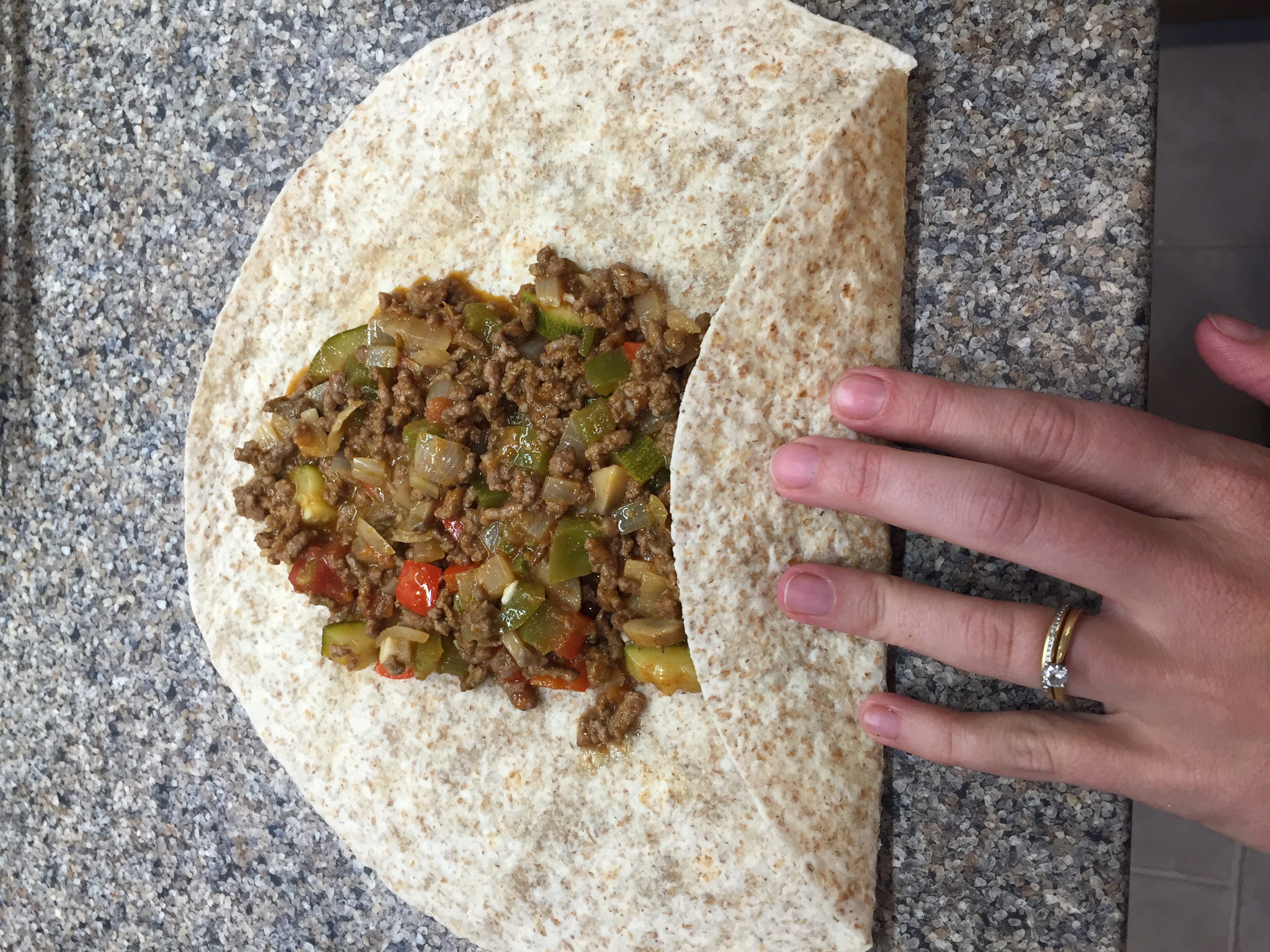 Ok- next we use the beef mixture to fill our tortillas! So spoon a couple of large spoonfuls into the upper middle of the tortilla like this.