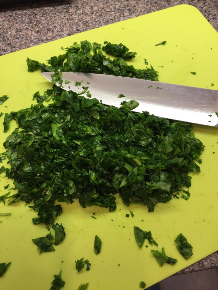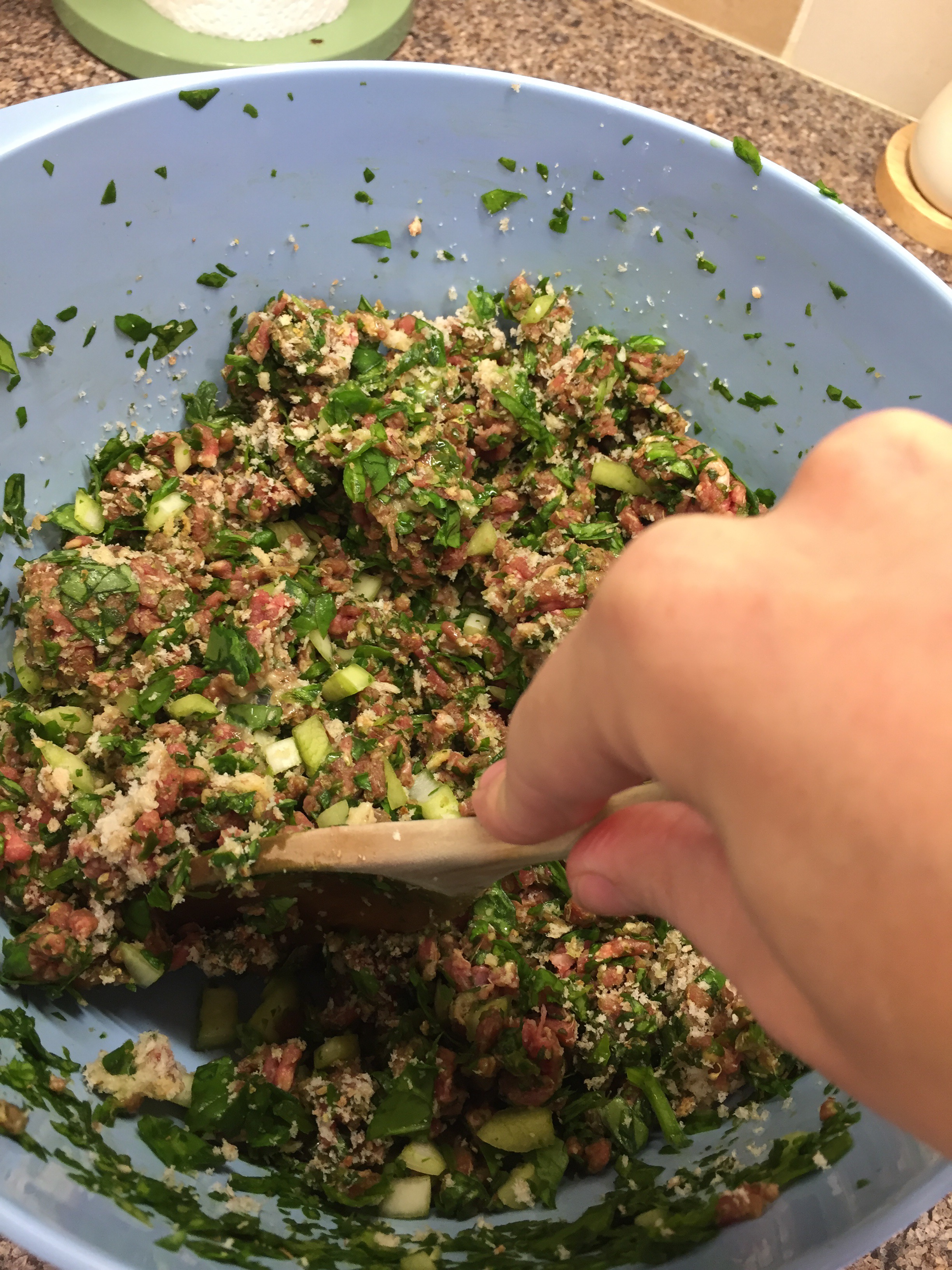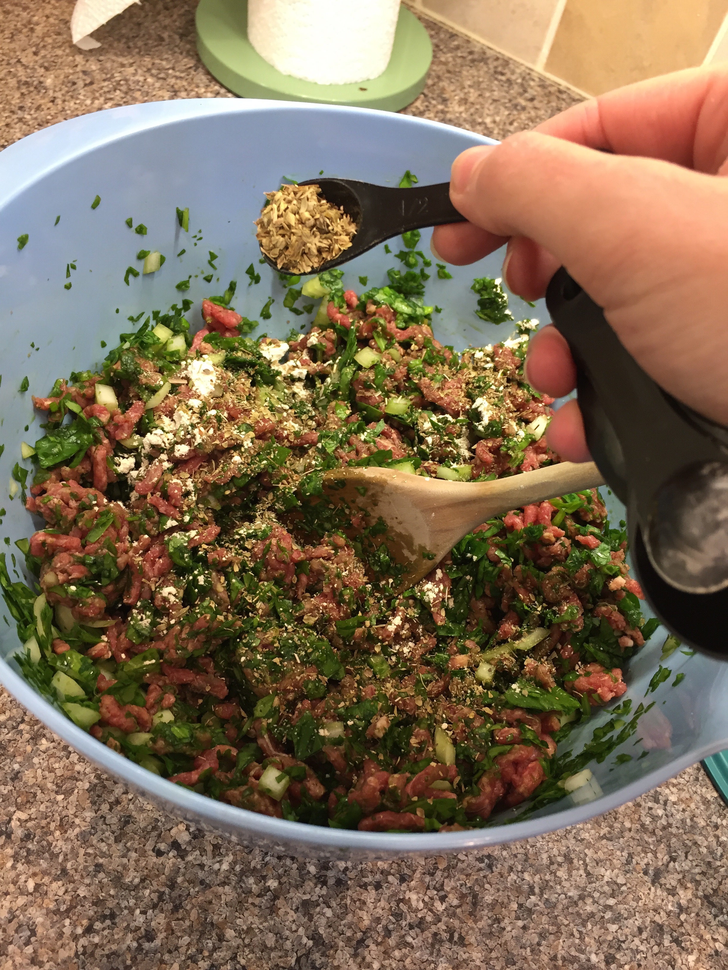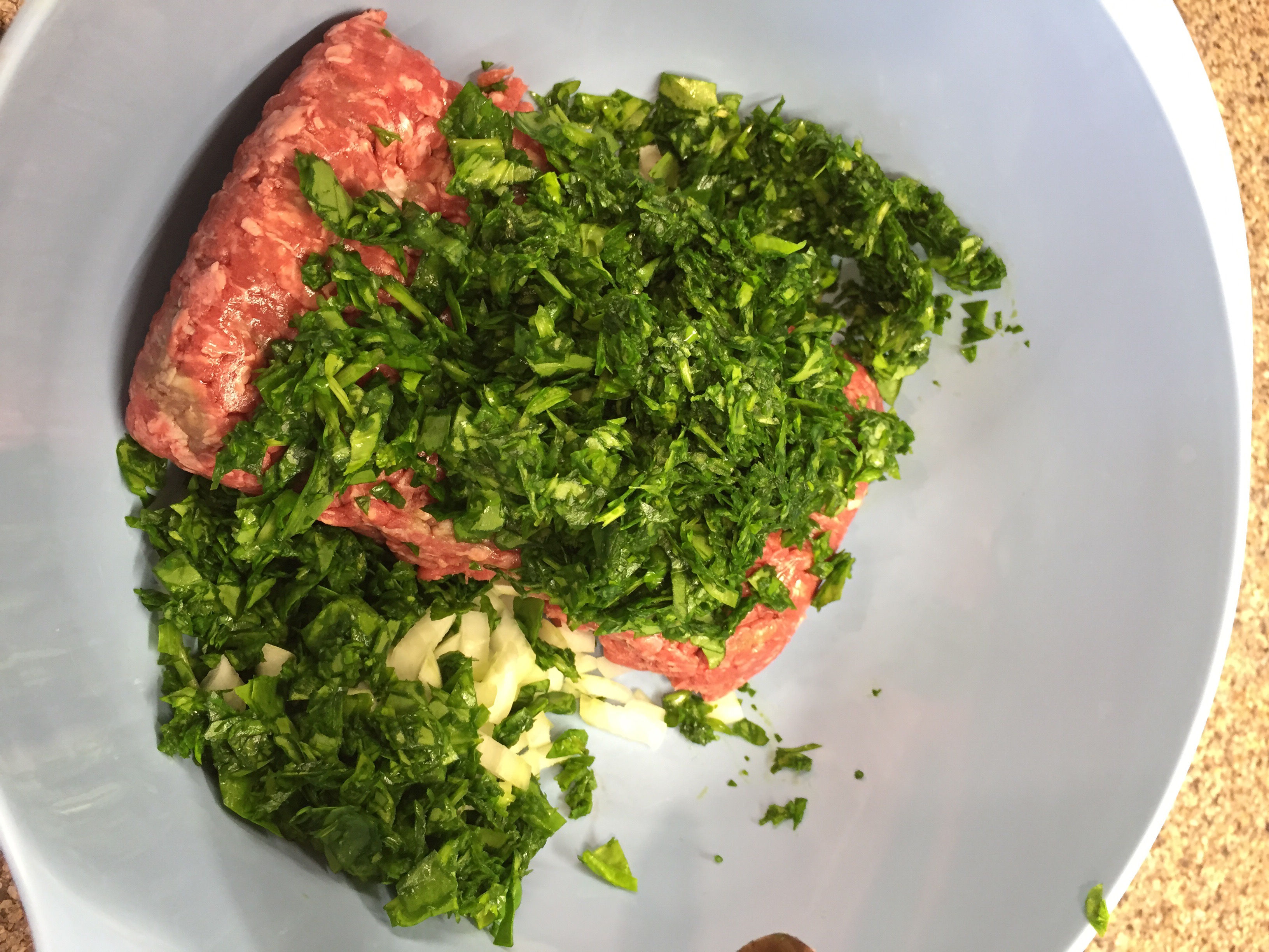 Put the mince, onions and spinach into a mixing bowl and start to mix together with a wooden spoon