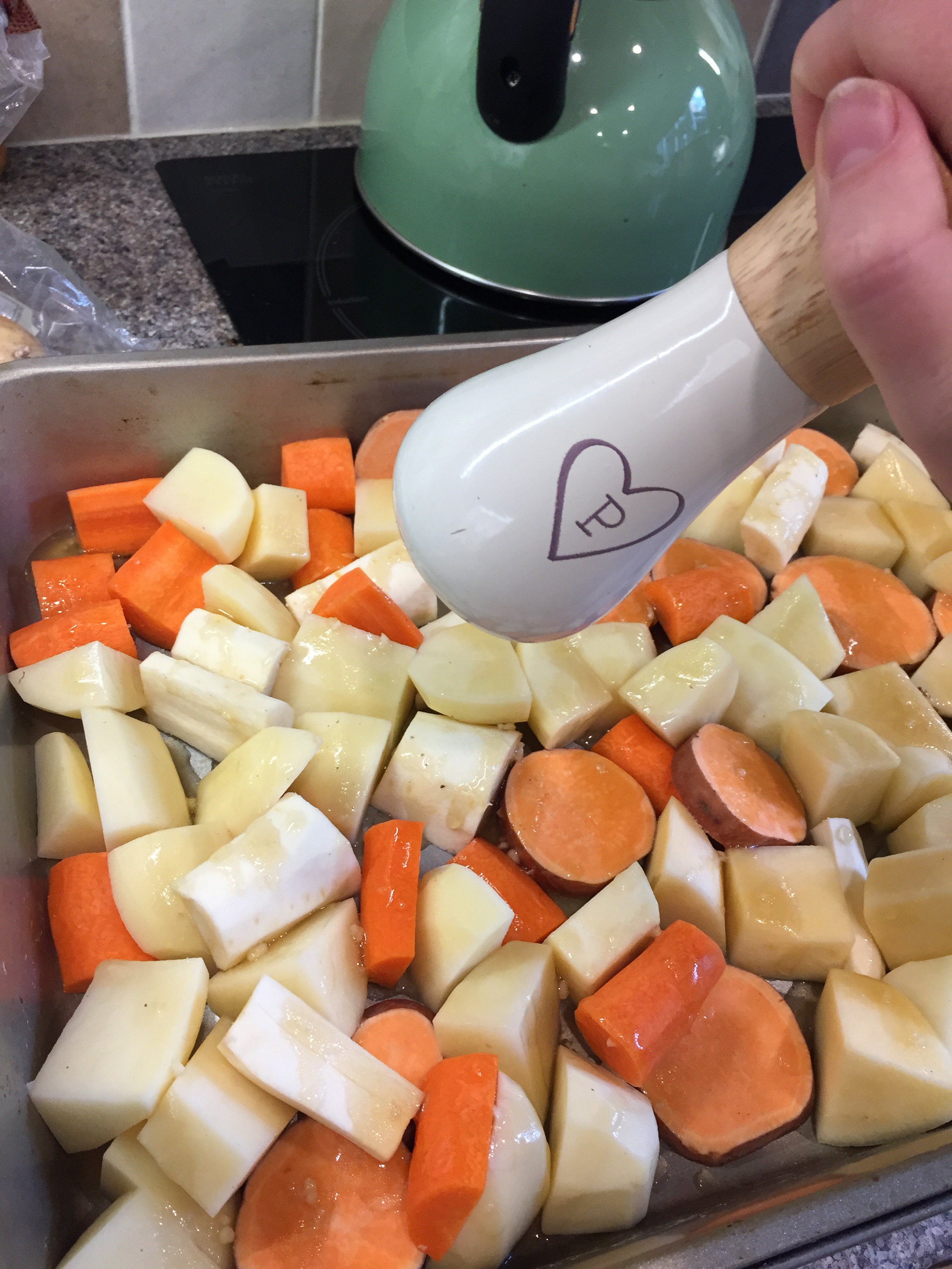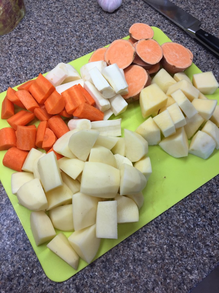 Peel and chop all your veg into chunks. I left the skin on the sweet potato.