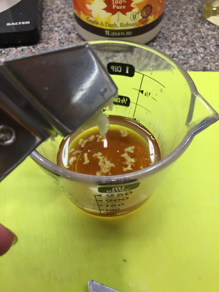 In a jug measure the oil and maple syrup then crush the garlic in. Use a fork to whisk it all together.