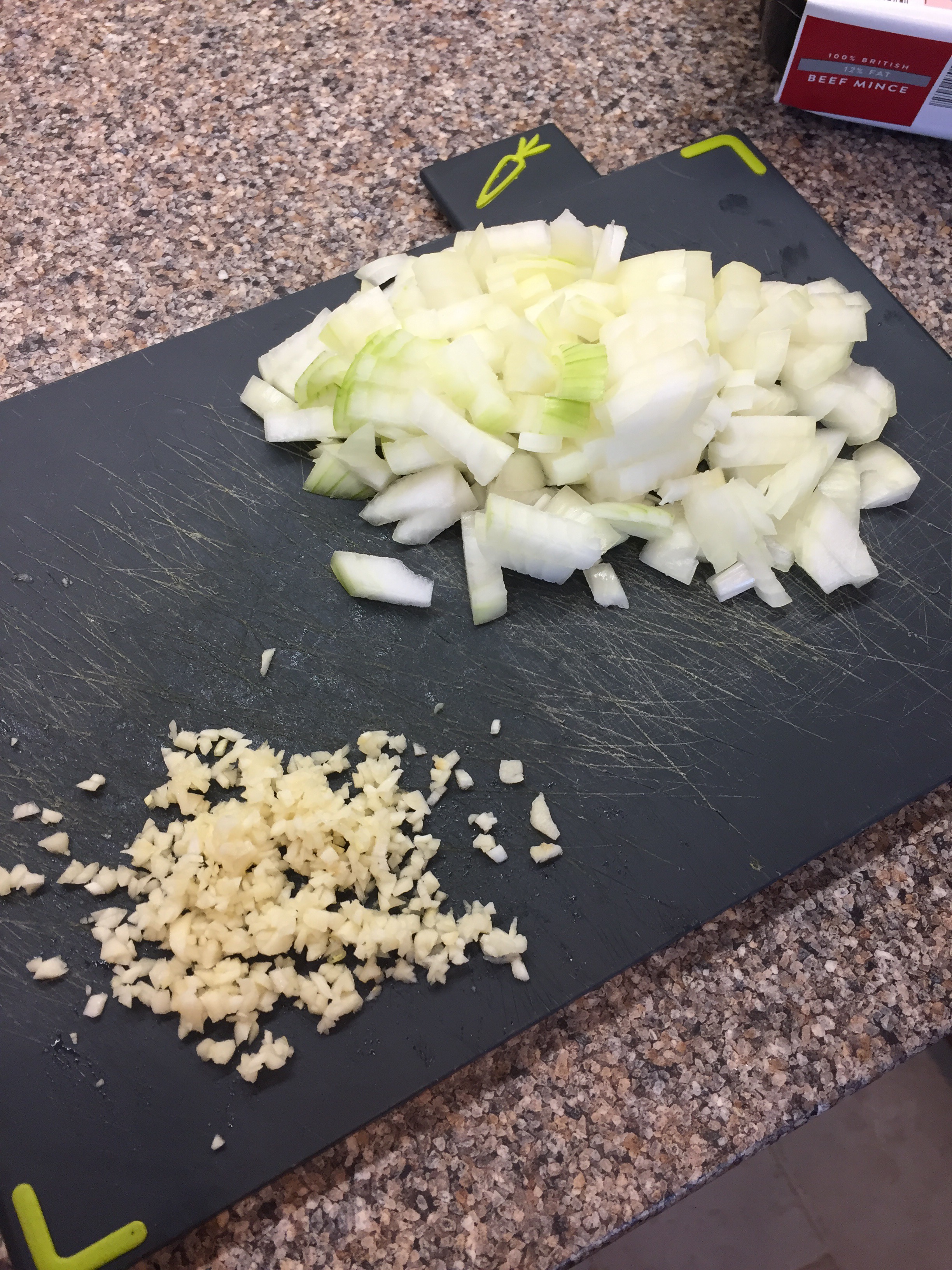Dice the onions and finely chop the garlic