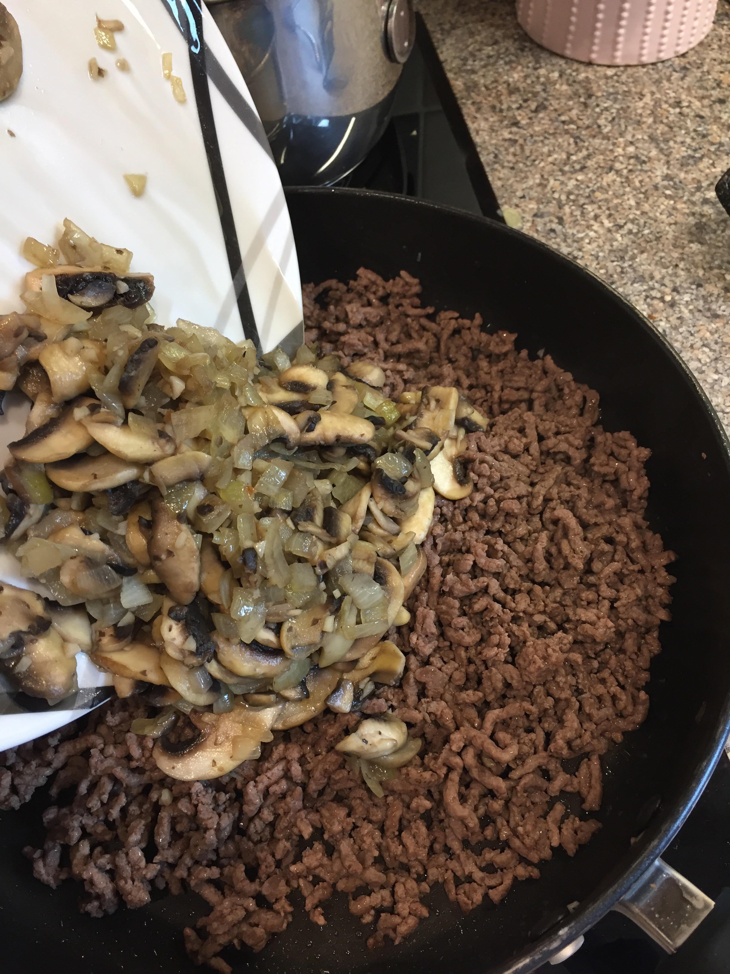 Drain off any excess moisture from the mushroom mixture and add them back to the pan.