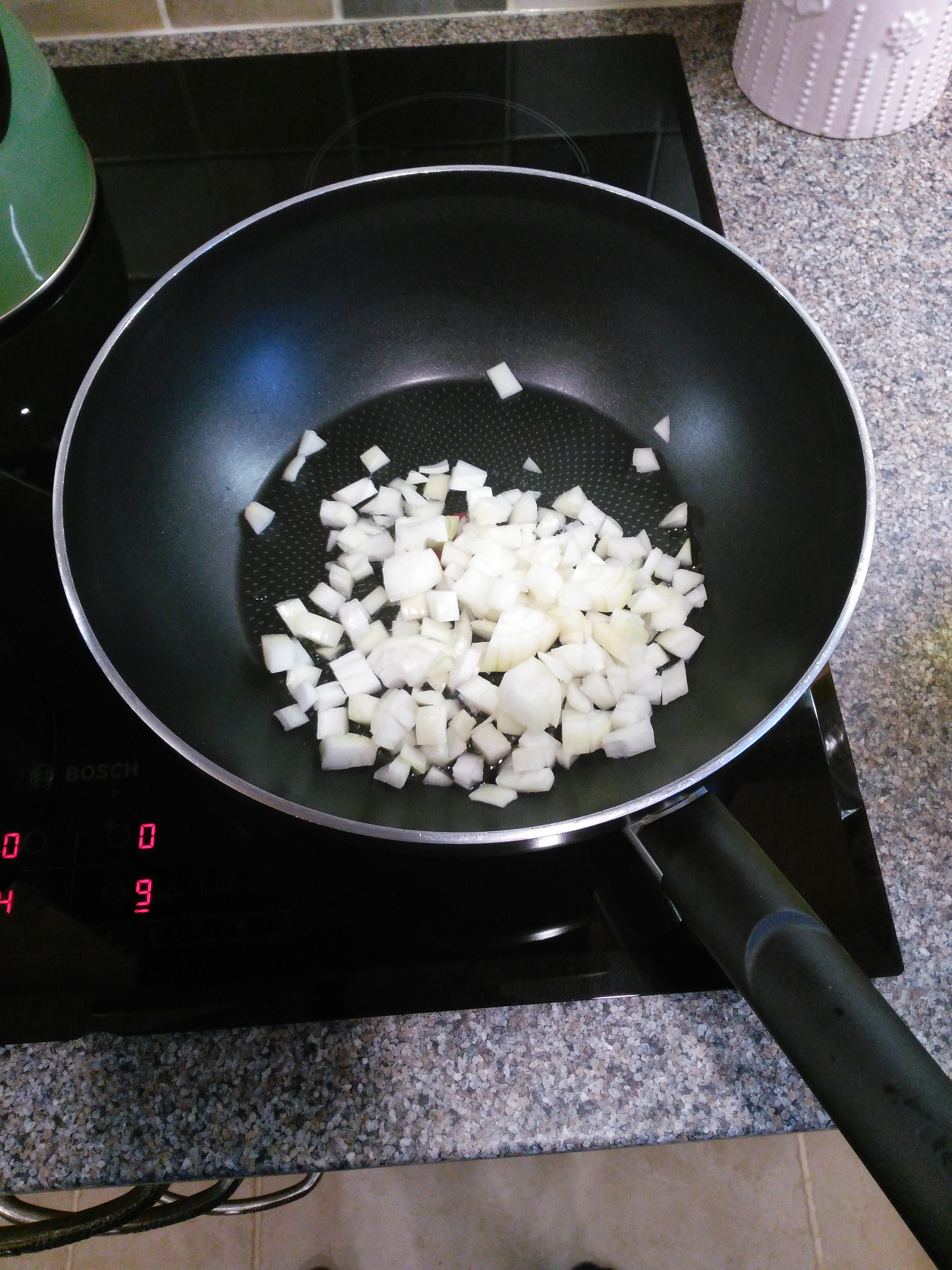 Dice the onions. Heat a tablespoon of oil in a deep frying pan and cook the onions on a medium heat for 5-6 minutes until softened