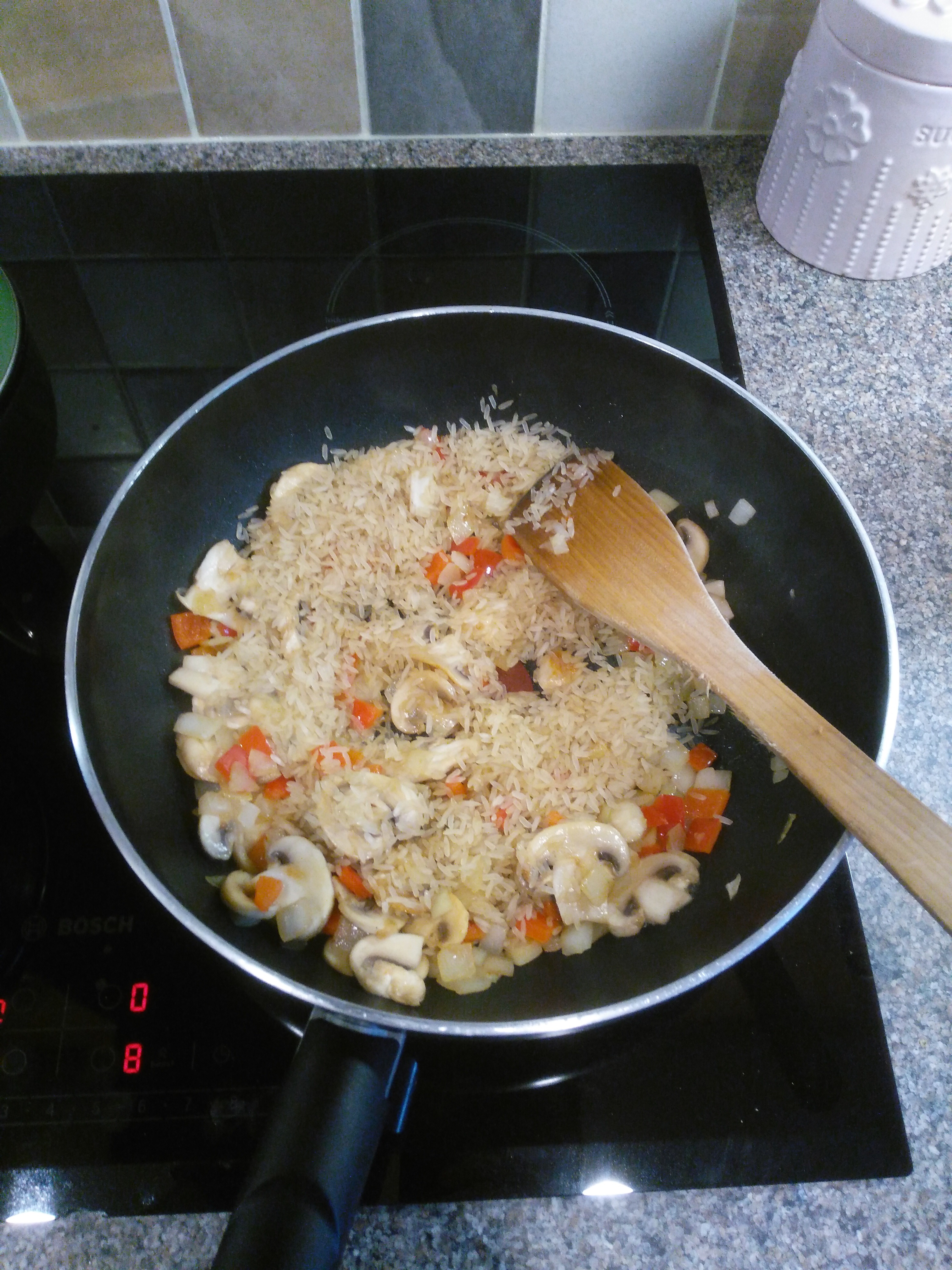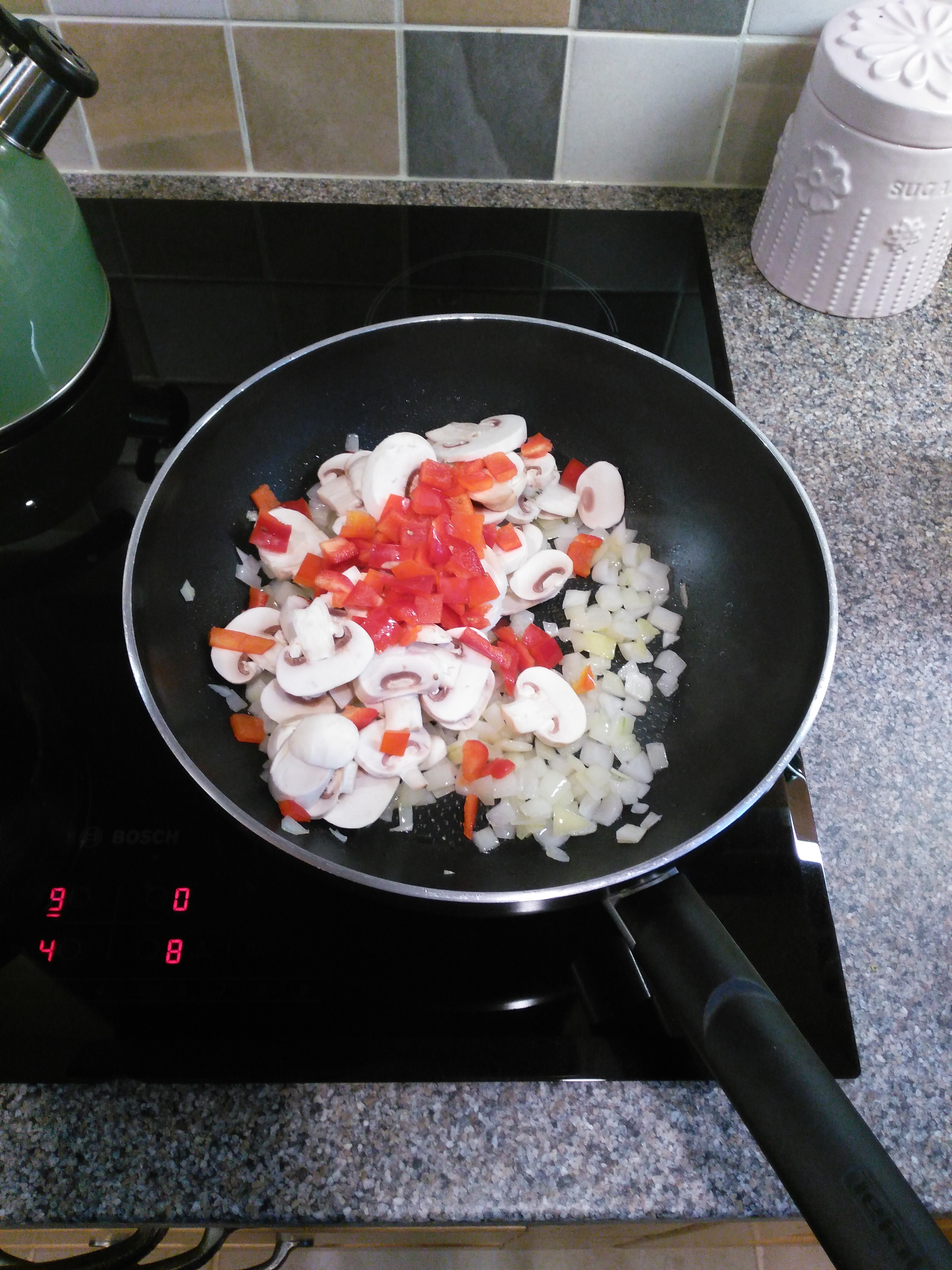Add the peppers and mushrooms to the pan and cook for another couple of minutes