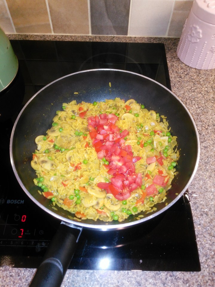 Finally cut the tomato up into small pieces and add to the pan, warming through for a minute