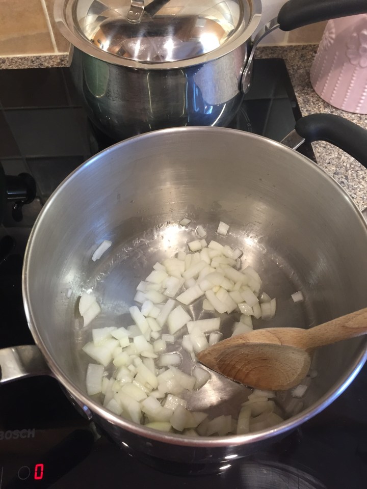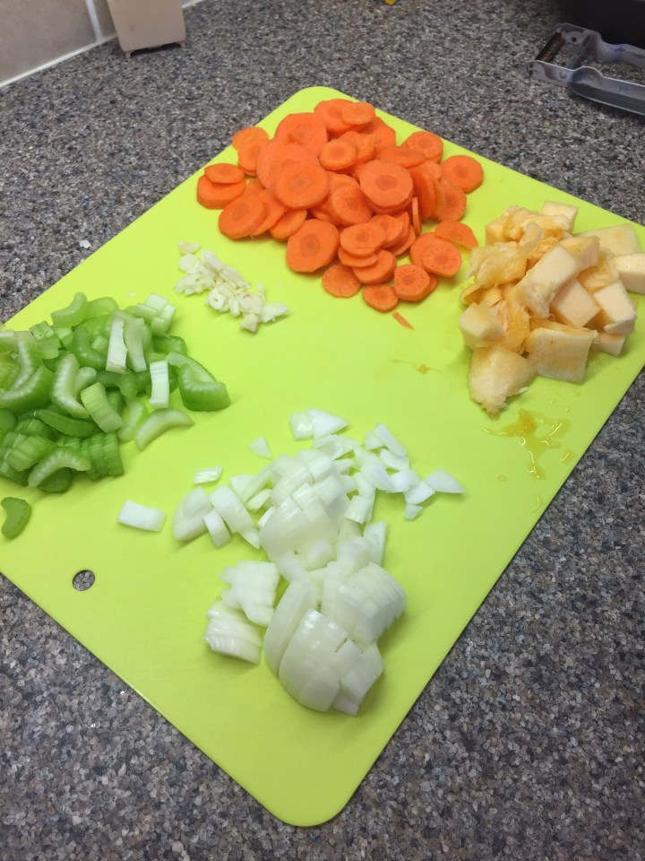 Dice the onions, chop the garlic, carrots and celery. Remove the skin and chop any bits of pumpkin you saved from carving (keep the slimy pulp separate)
