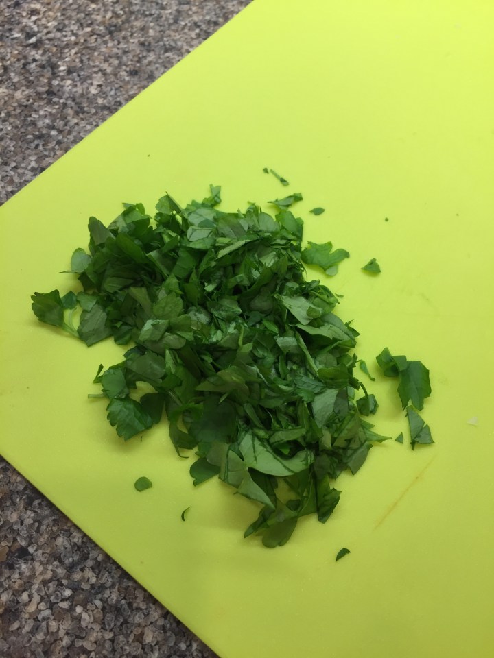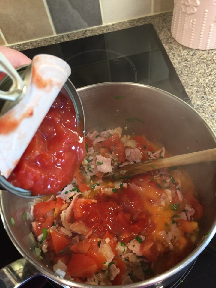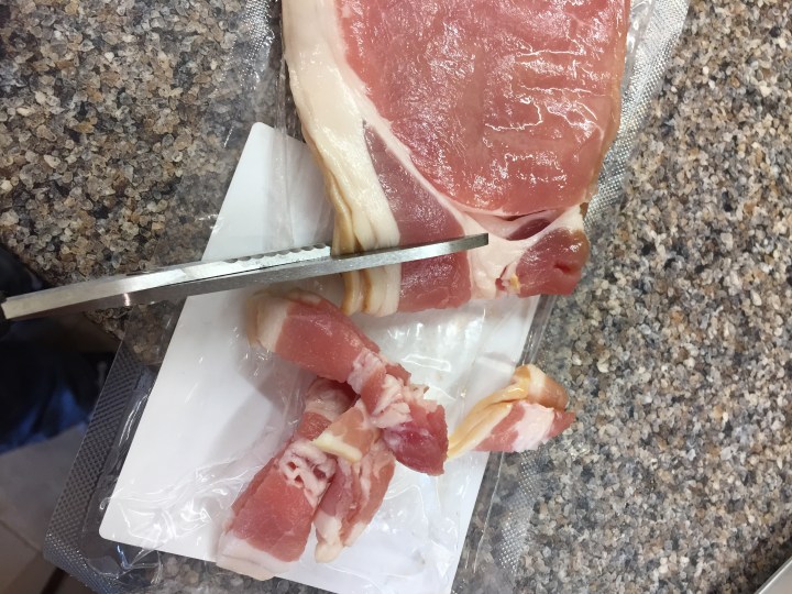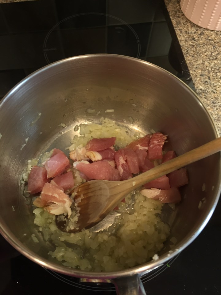 Meanwhile- another optional extra is to add bacon. If you’re doing that use kitchen scissors to cut into chunks.