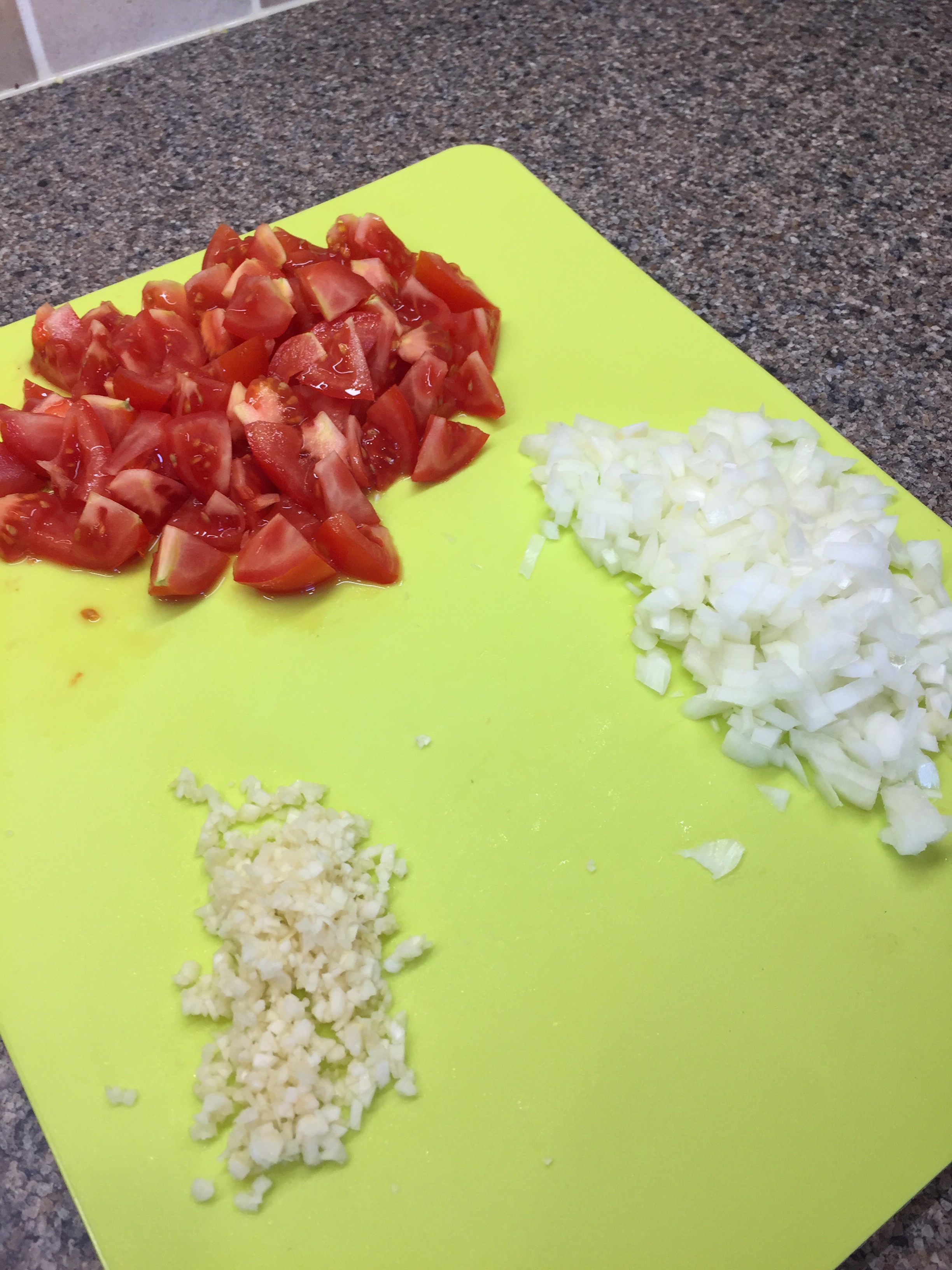 Finely chop the onion and garlic. Cut the tomatoes into small chunks