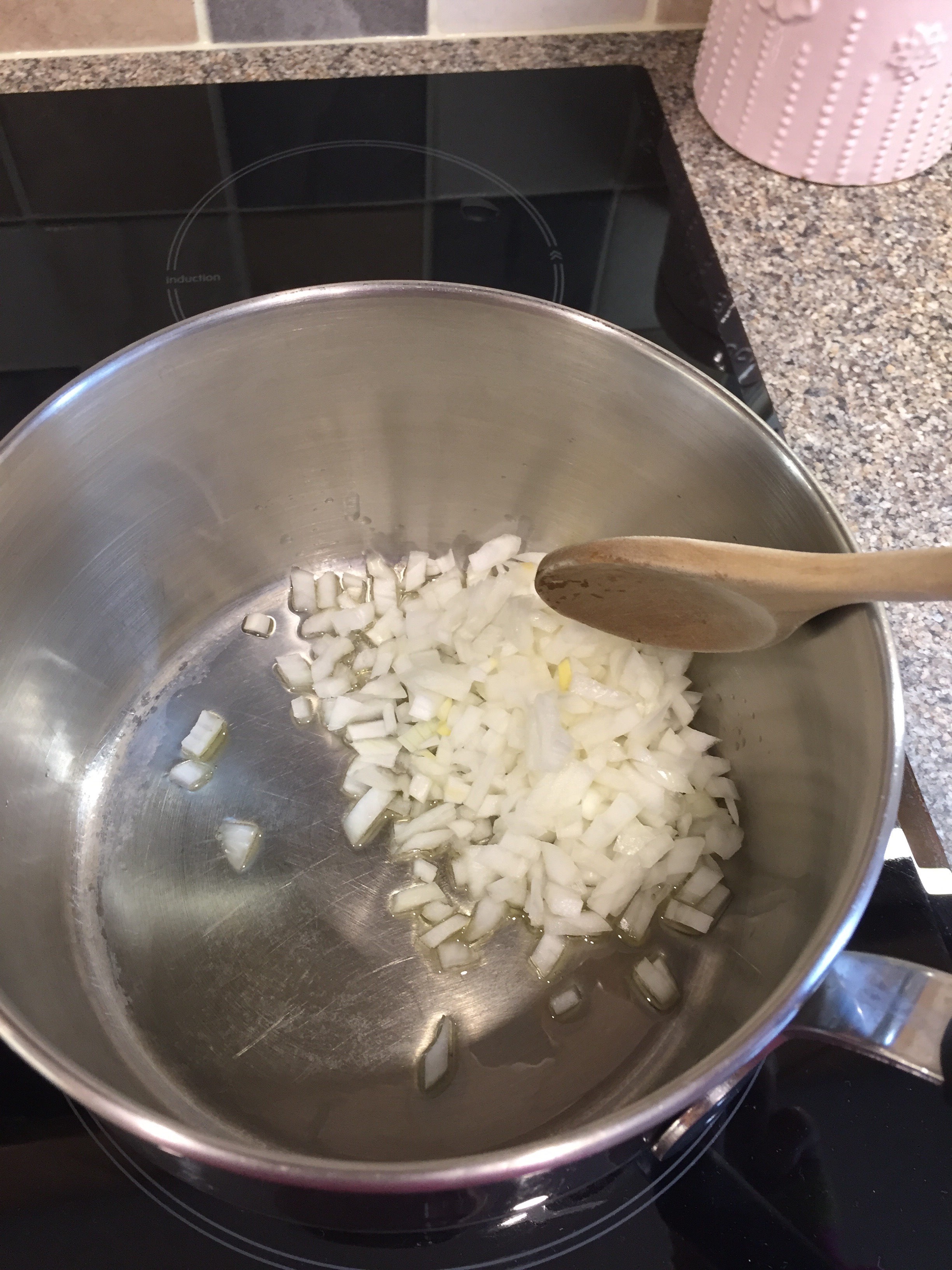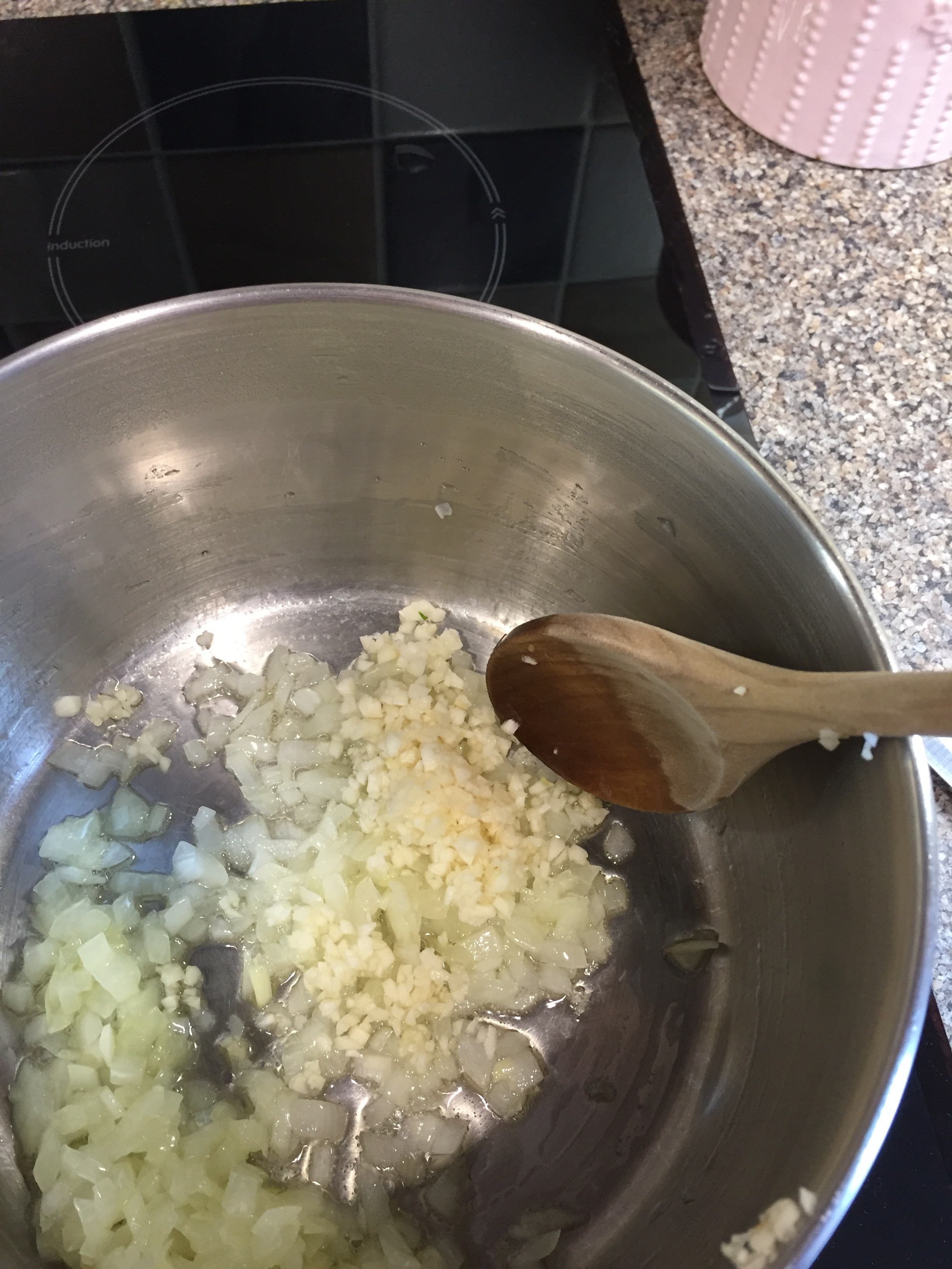 Heat 2 tablespoons of oil in a large pan and add the onions. Cook on a low to medium heat for as long as you can! At least 6minutes but ideally 10-15mins. You want them to loose their ‘bite’