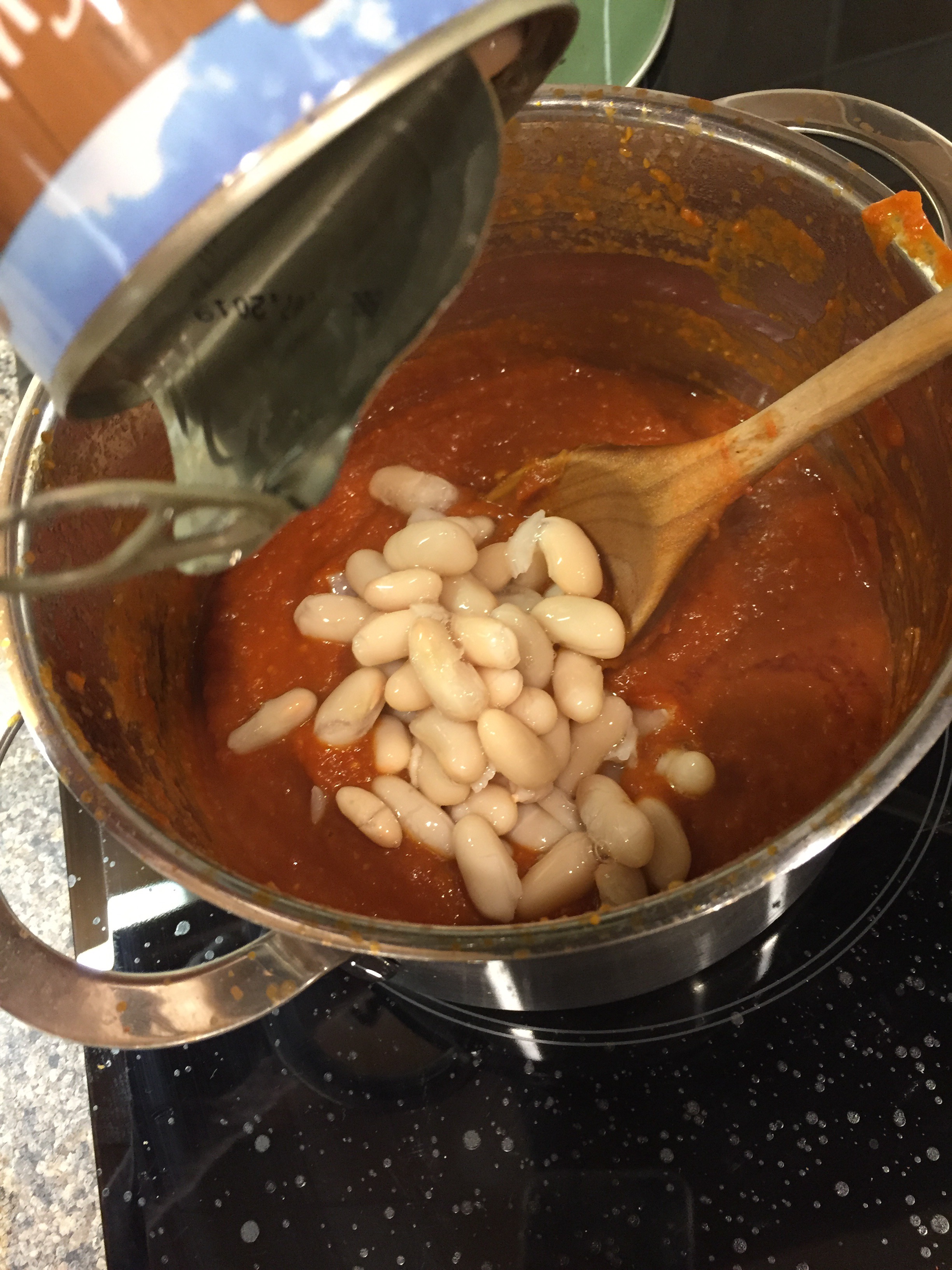 Add your beans! Pretty much any beans will work- once I’d added the cannellini beans it looked a little sparse so I topped it up with some butter beans. Kidney beans would also work great.