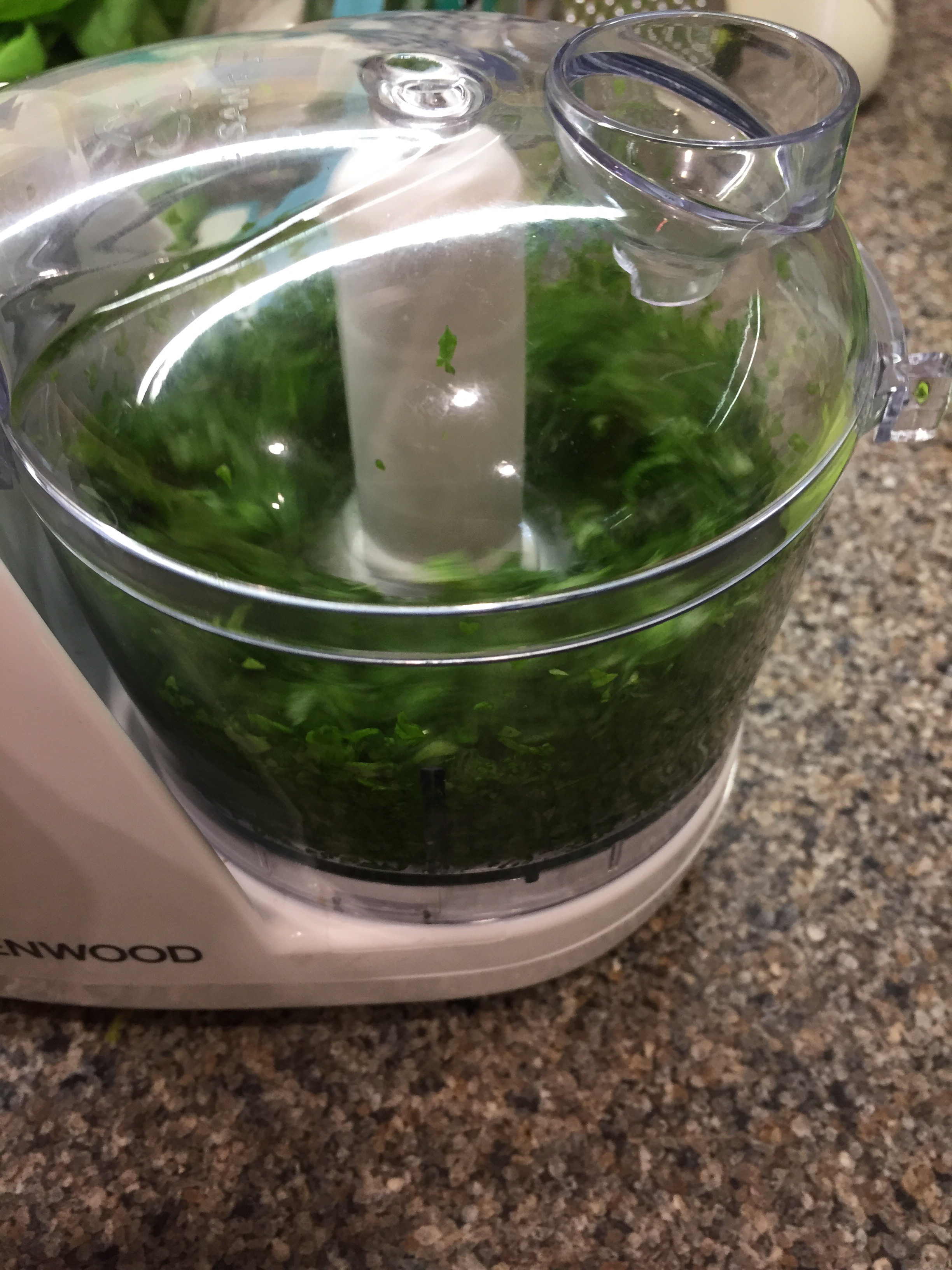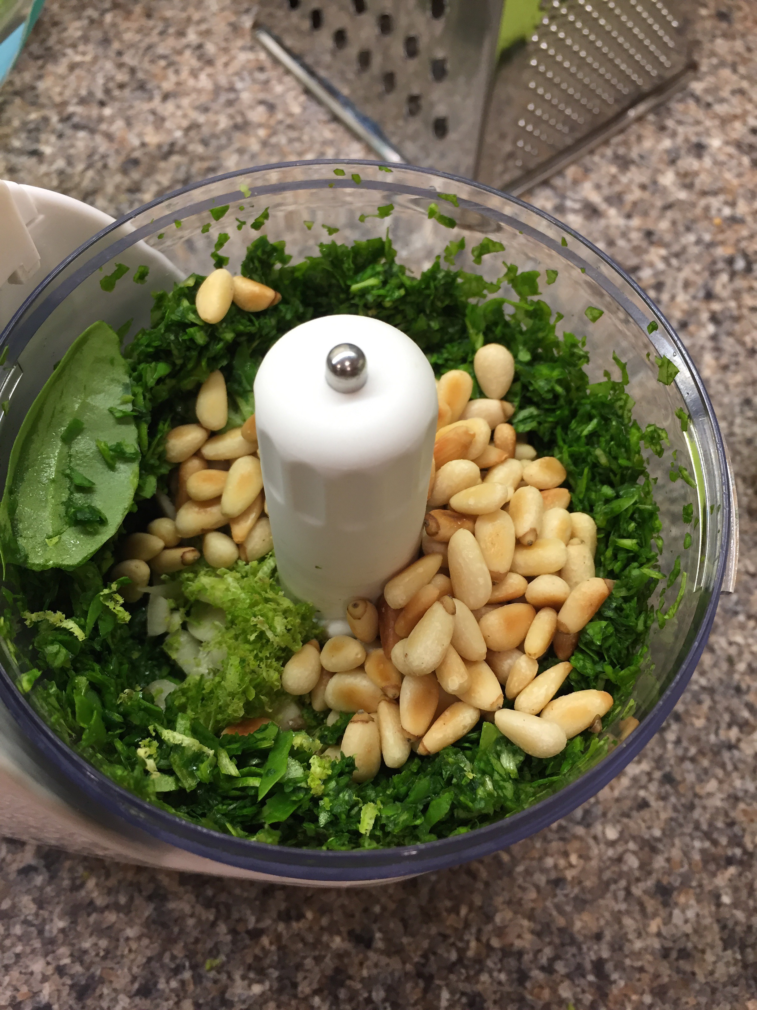 Add the roasted pine nuts to the food processor along with the lime peel, garlic and a little salt & pepper. Whizz everything together.