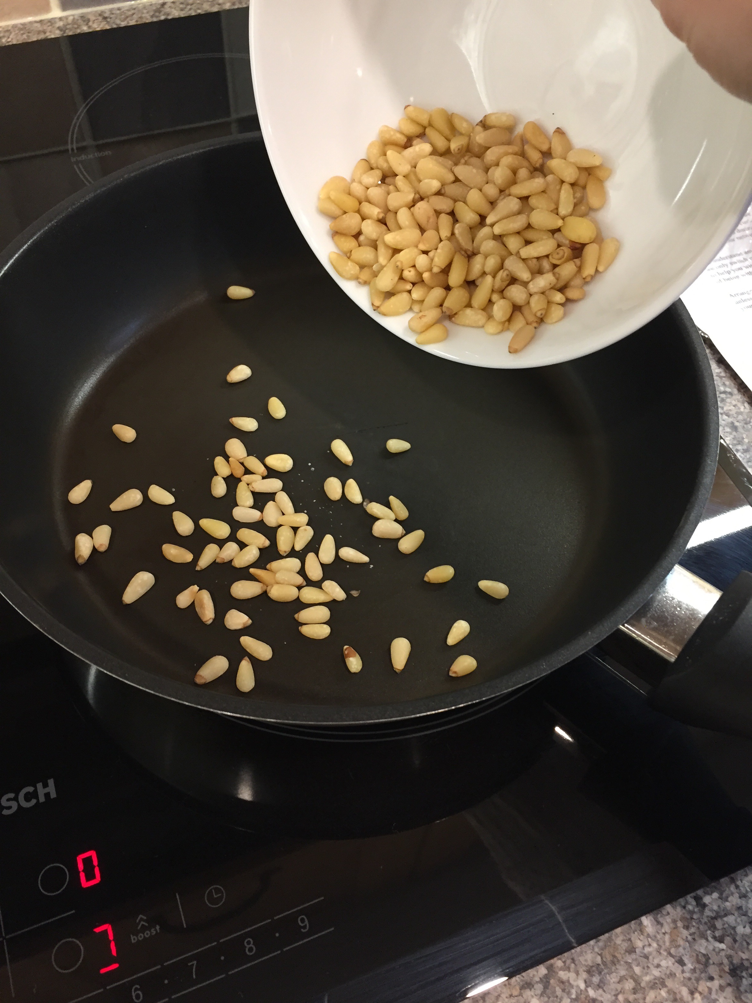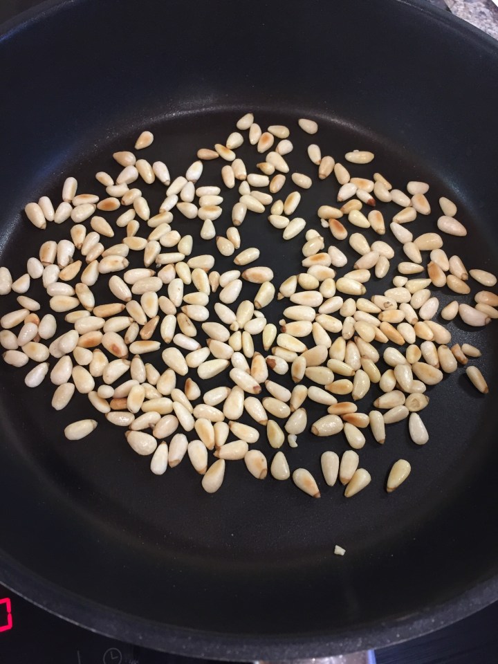 Heat a frying pan (no oil) and add the pine nuts