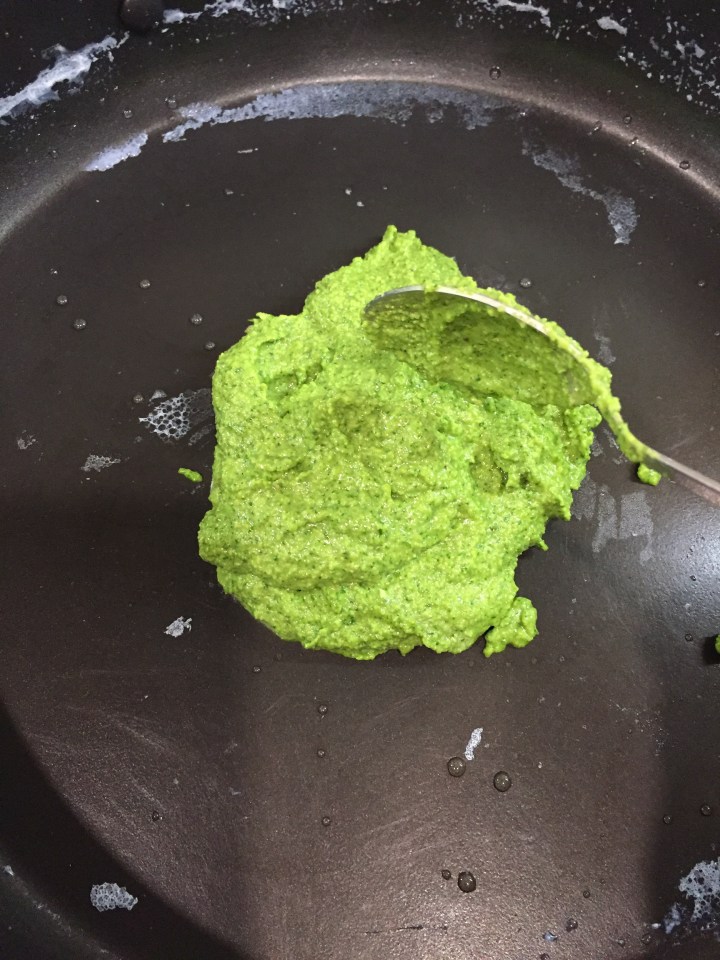Now add the pesto to the pan and put it back on the heat