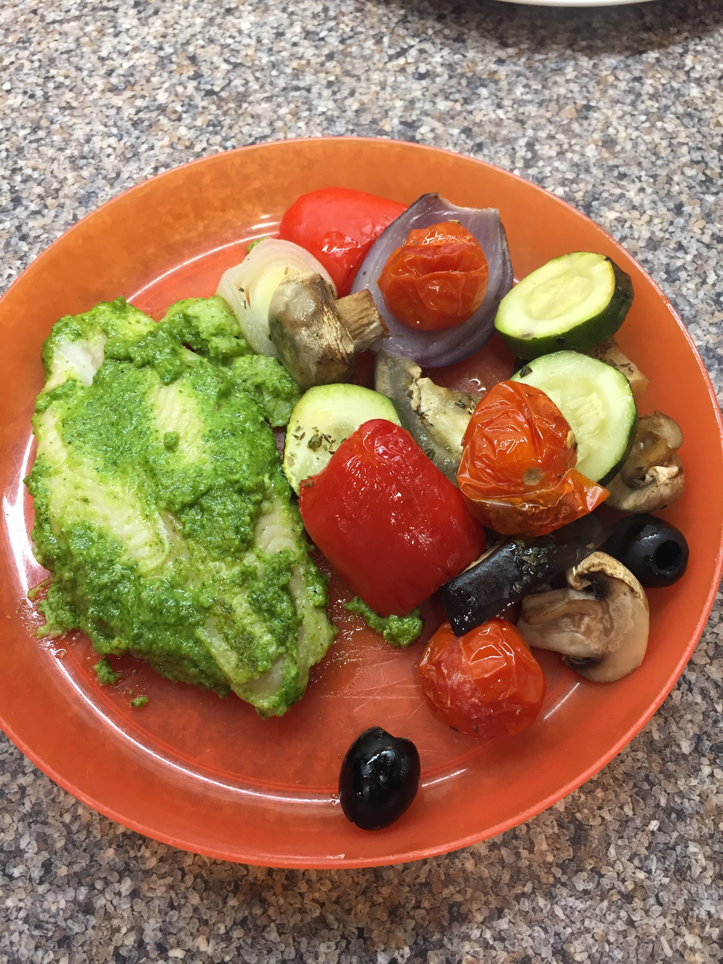 Frozen fish actually cooks pretty well and is worth keeping in the freezer for those days when the cupboards look bare! This recipe tarts up basic white fish and adds tons of flavour. I love pesto but hubby’s not a fan so I guess it’s a love it or hate it thing. Baby (now 8 months old) was definitely in the love it camp!!
