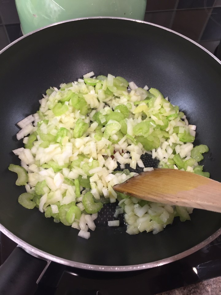 Add the onion and celery and cook on a medium-low heat for 5-6mins