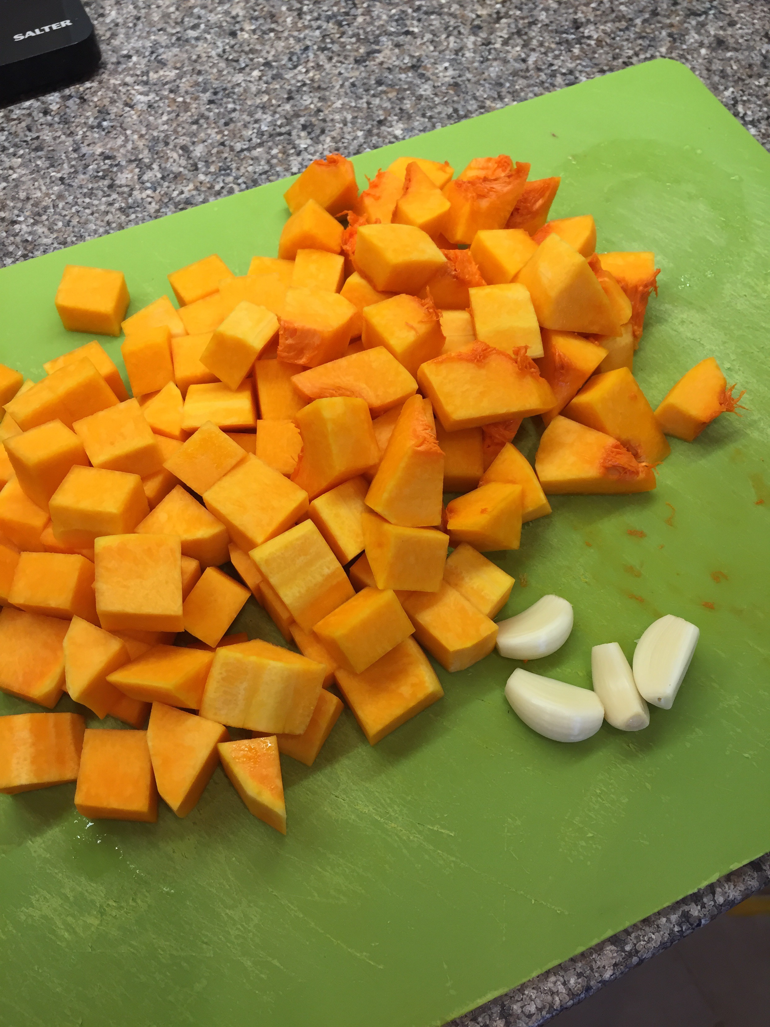 Peel and de-seed the butternut squash before cutting into small cubes. Peel the garlic cloves but leave them whole.