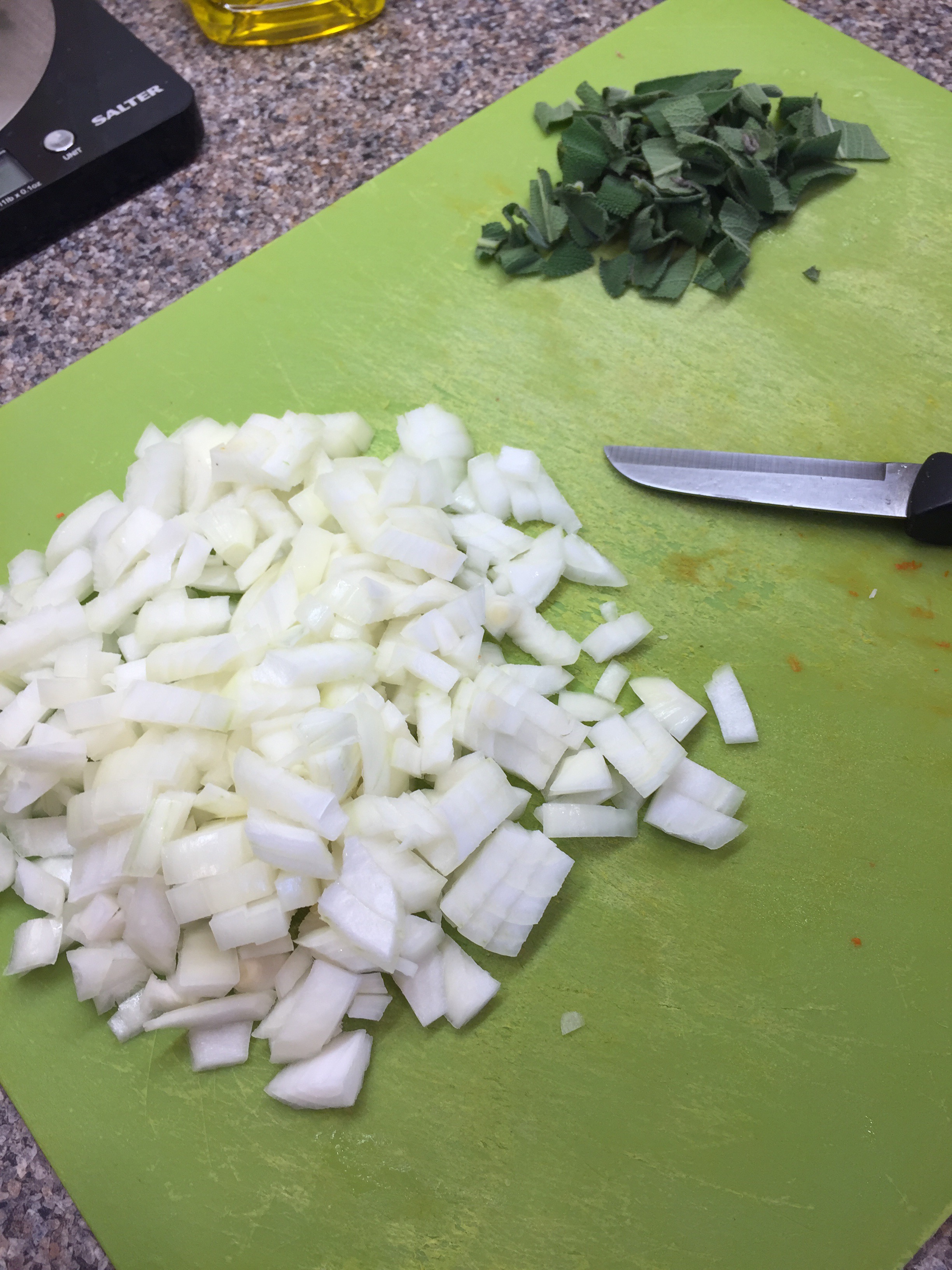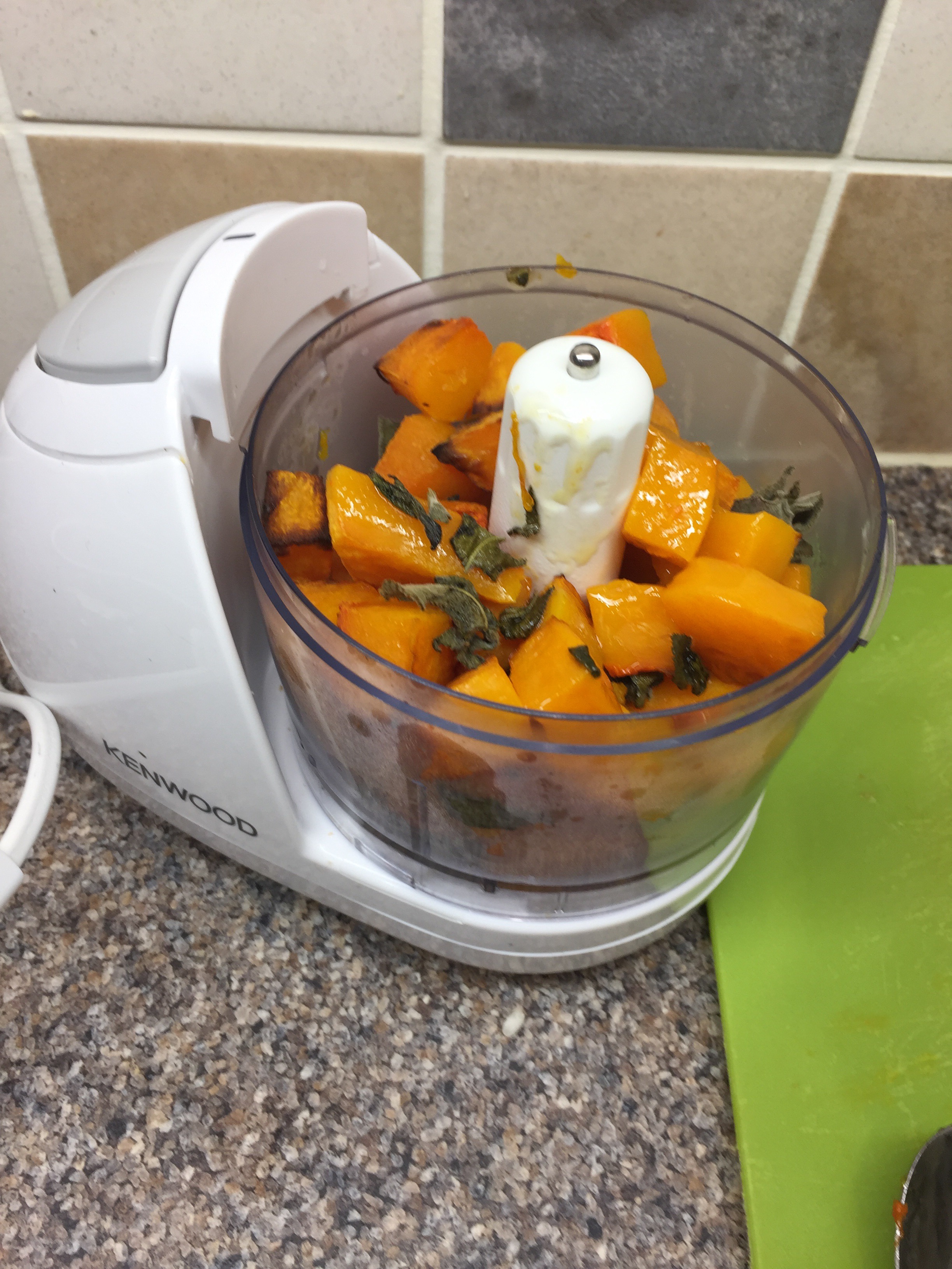 Put around half of the roasted squash in a blender with all of the garlic and sage.
