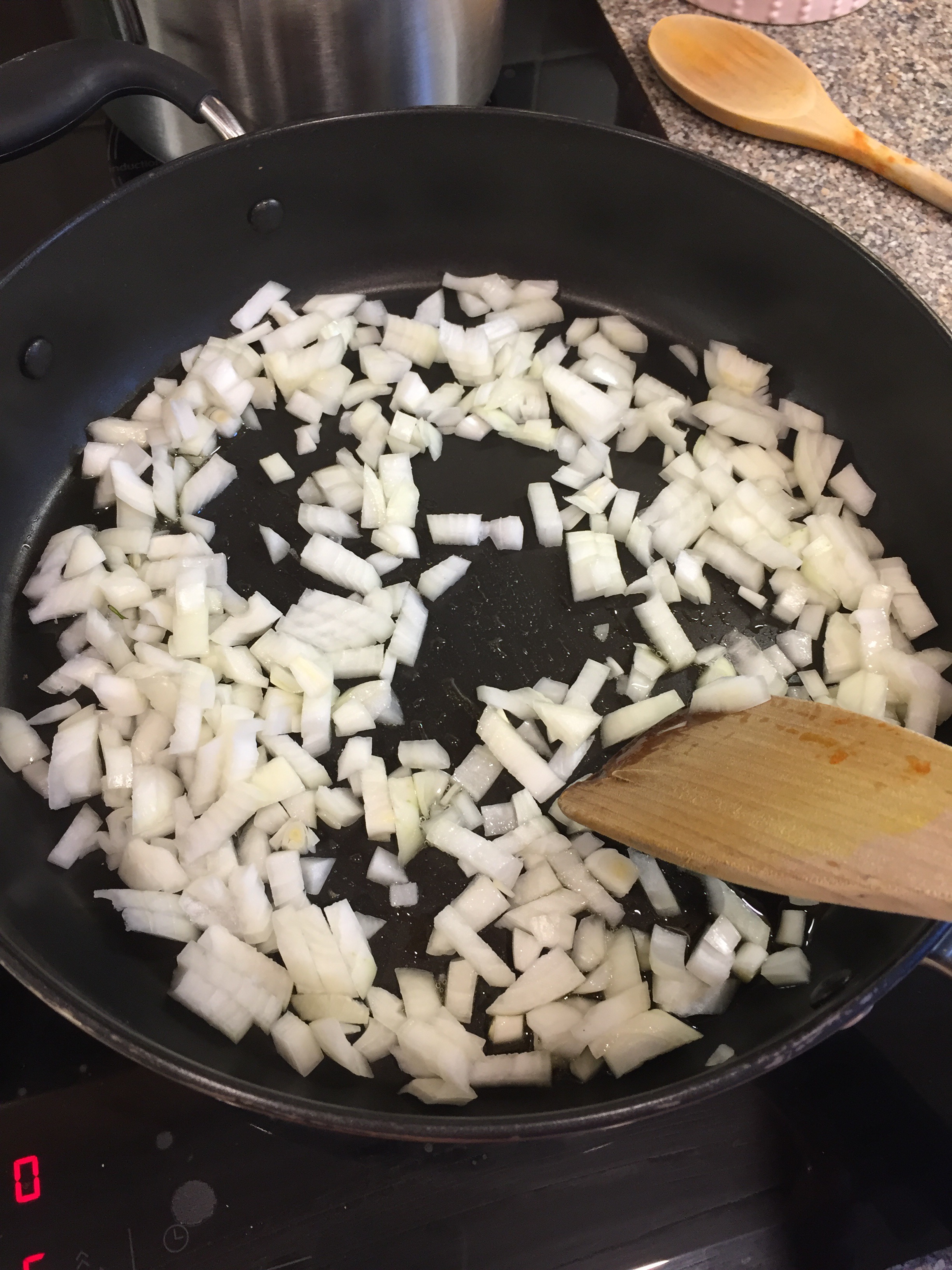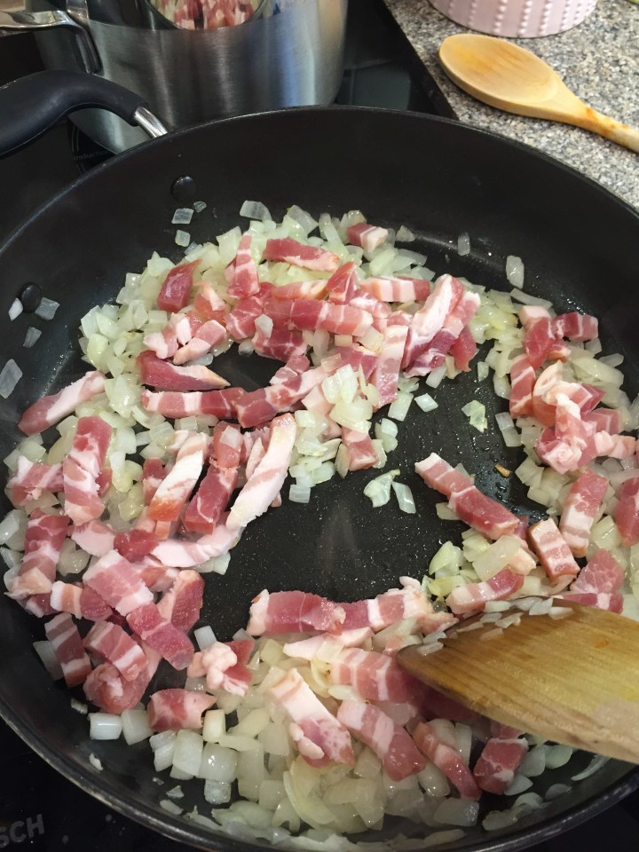 If you’re adding bacon/ lardons add these now and turn up the heat and cook until done