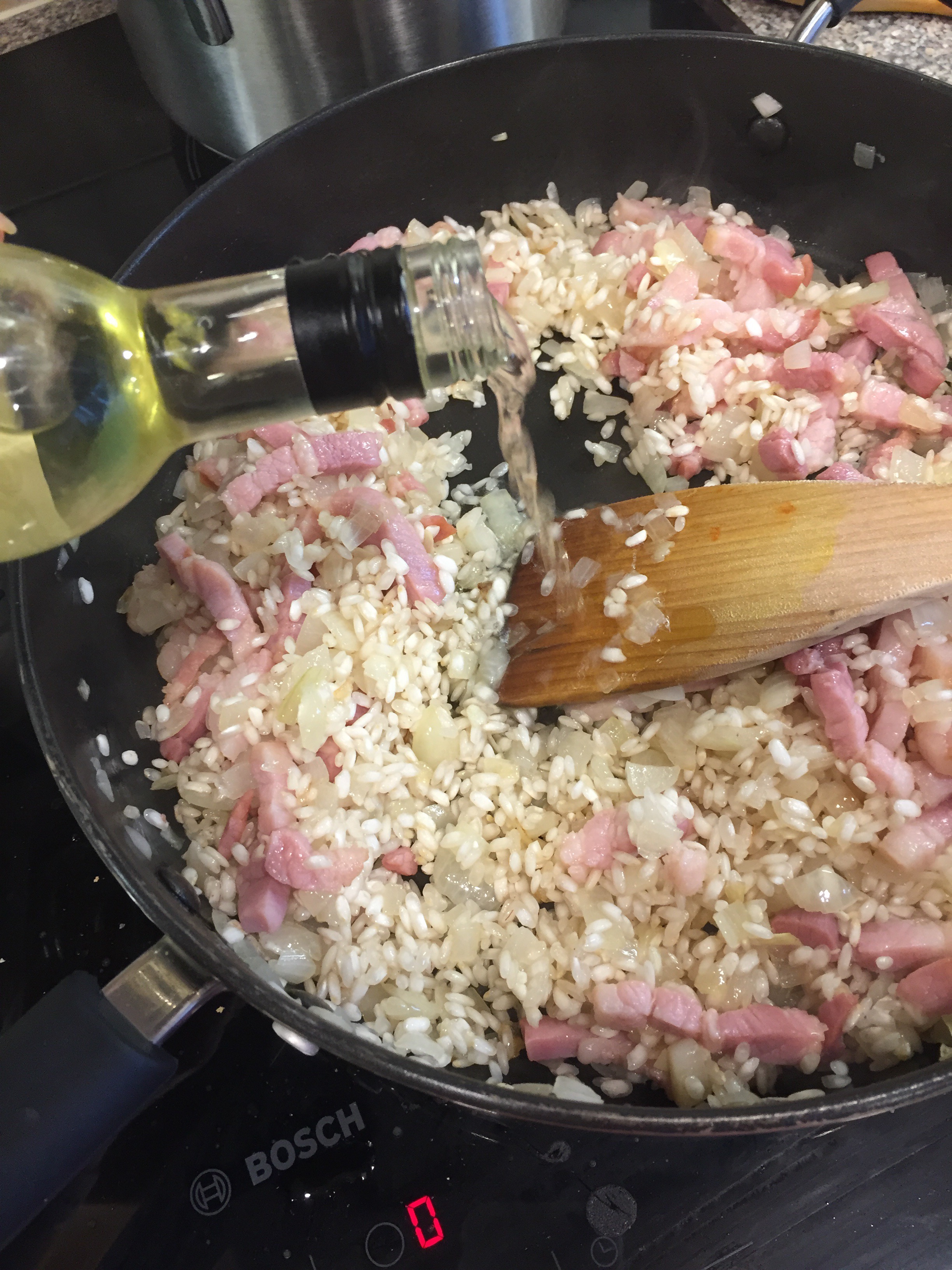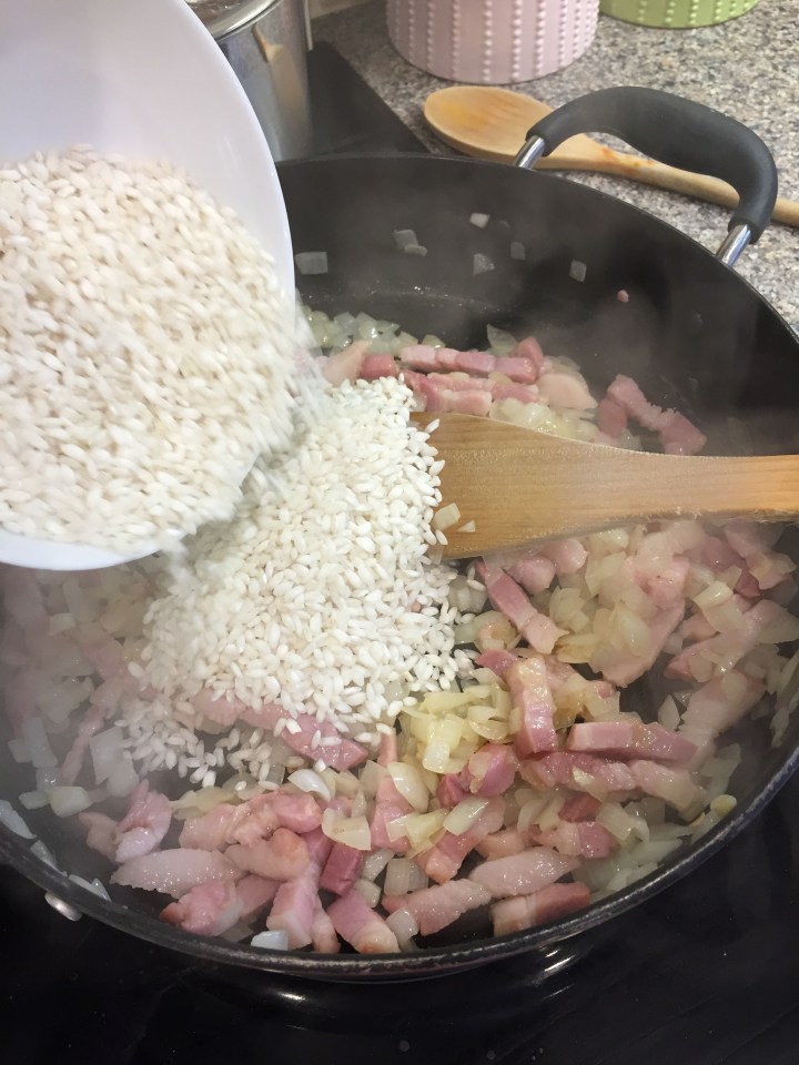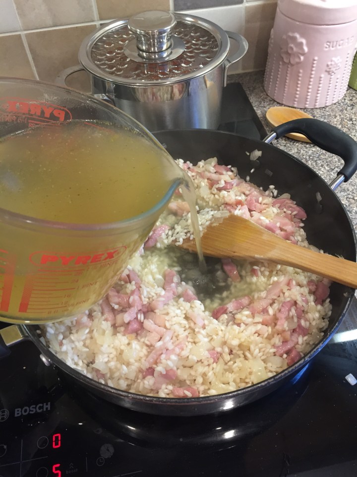 Start to add the stock- a ladle worth at a time- and stir constantly as the rice absorbs the moisture. Repeat over and over until the rice looses its bite.