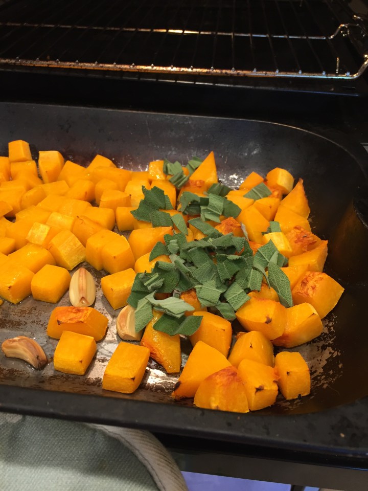 Around 10mins before the end of cooking the butternut squash throw the sage into the roasting pan so it roasts for 10mins