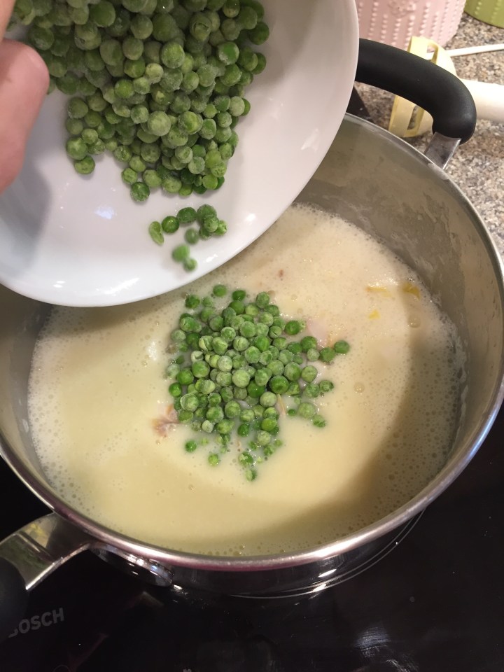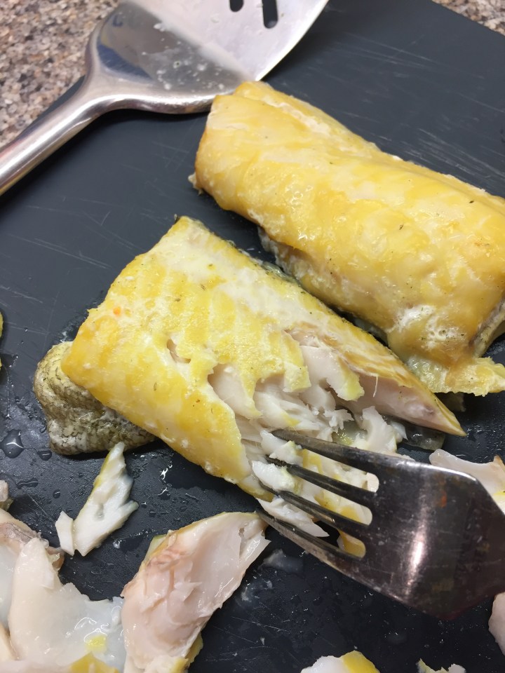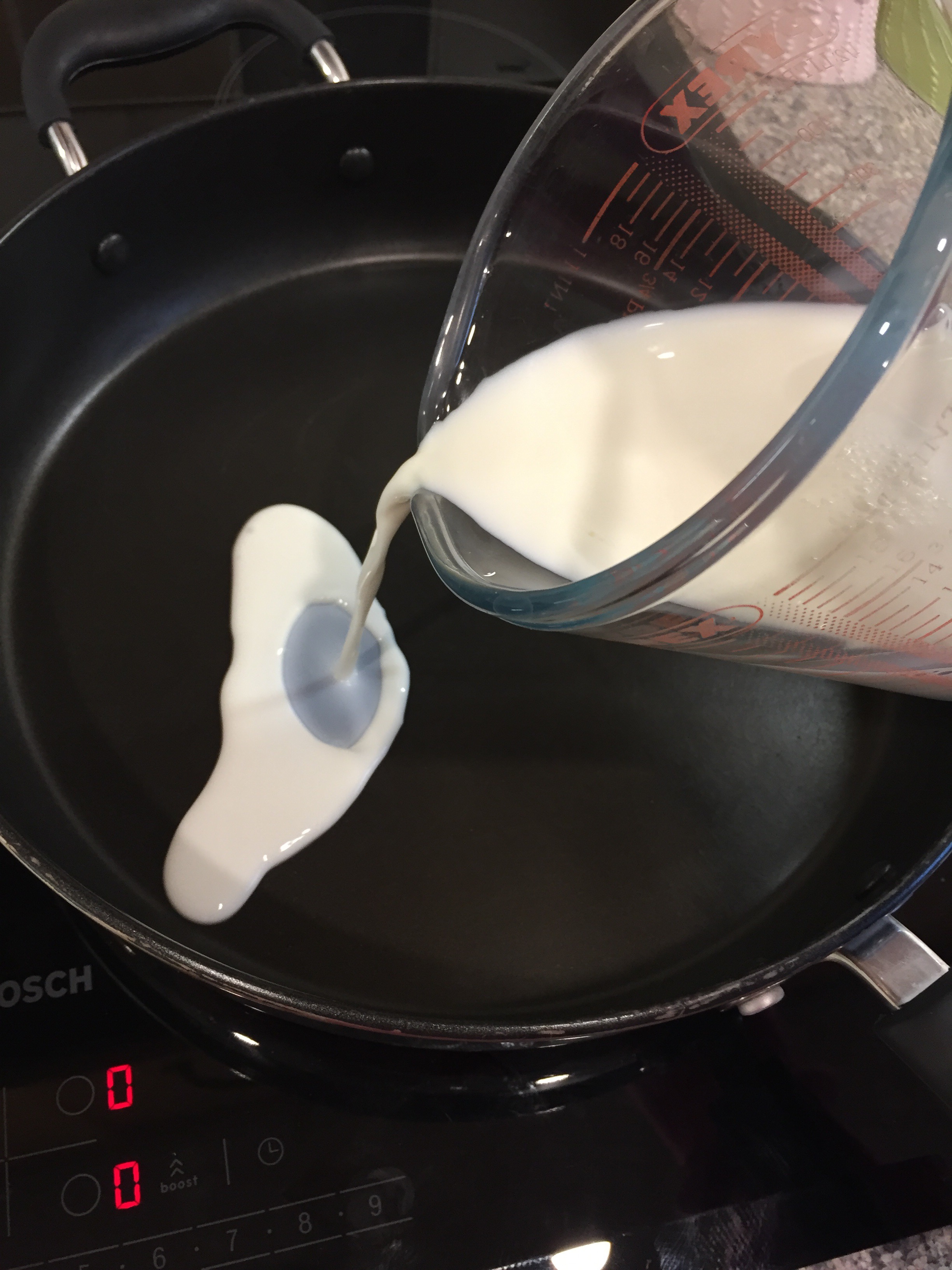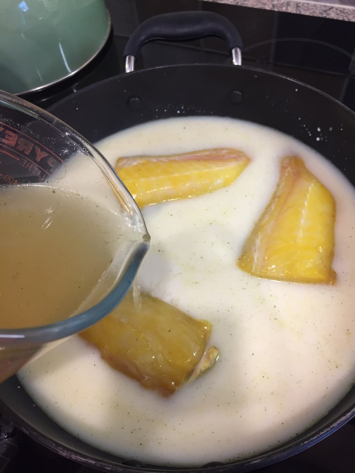 Once the potato is soft pour in the retained liquid from the fish poaching pan