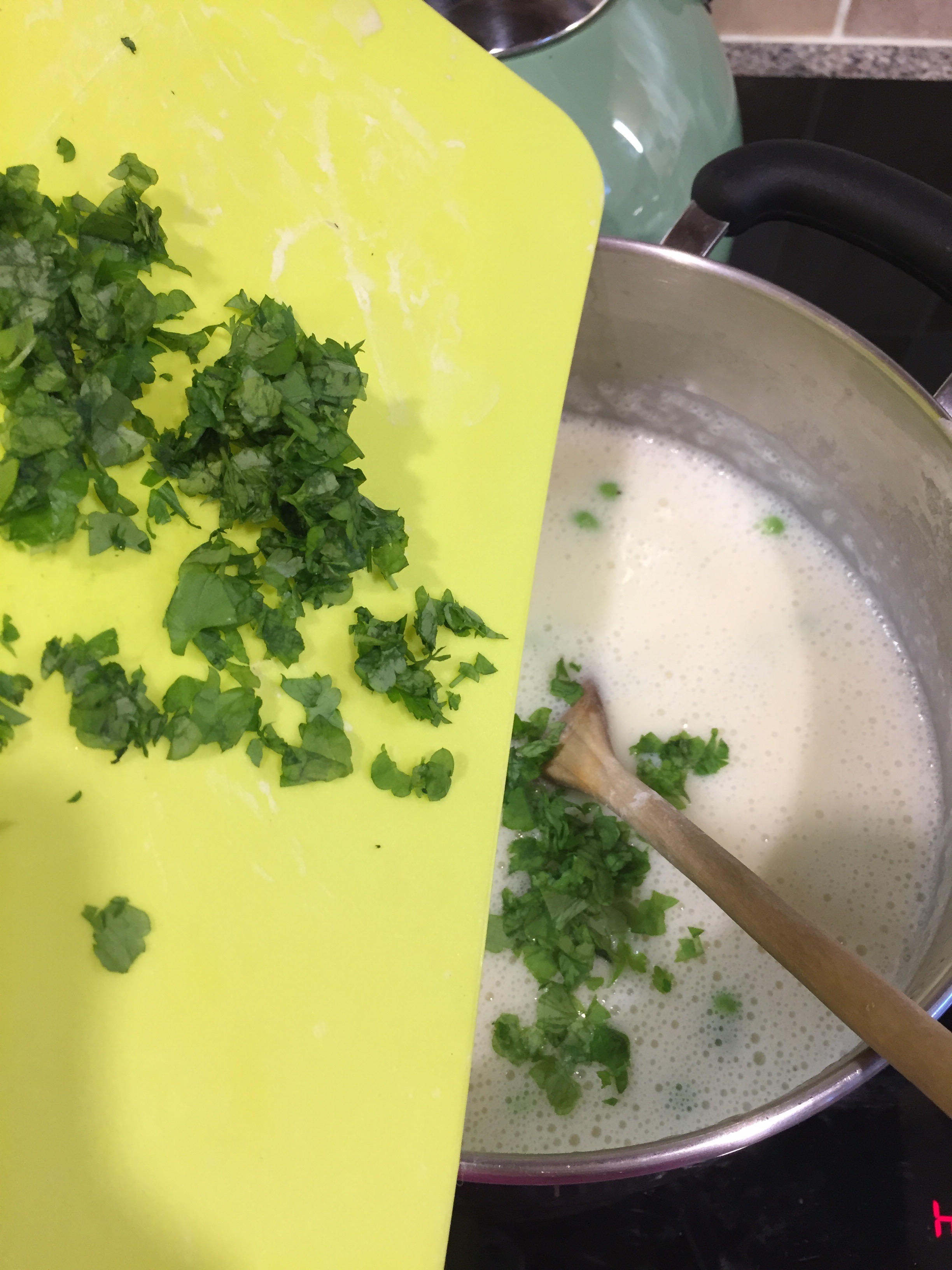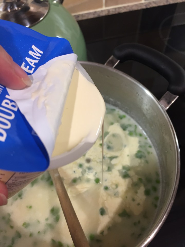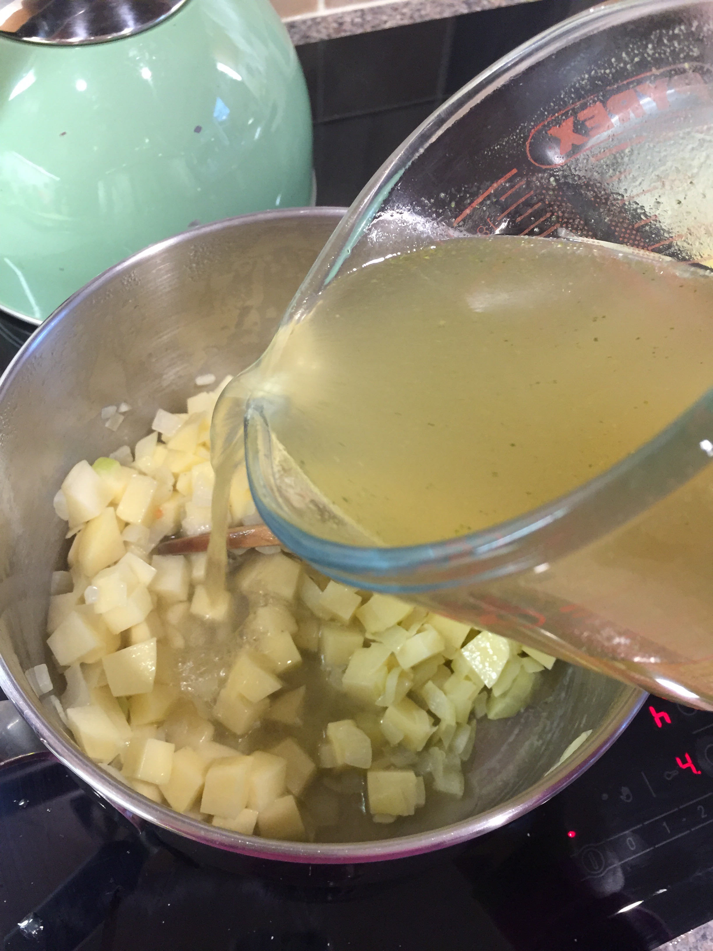 Then pour in the rest of the stock, bring to the boil and reduce to a simmer for around 15mins until the potato is soft