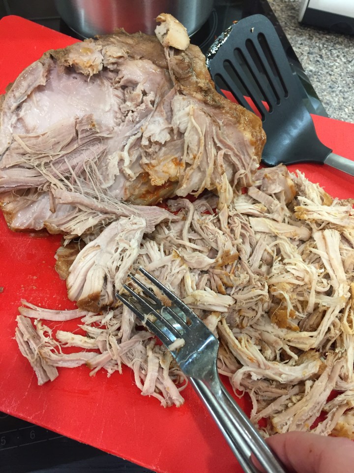Remove the joint and use 2 forks to shred the pork into strands. Discard any large fatty parts.