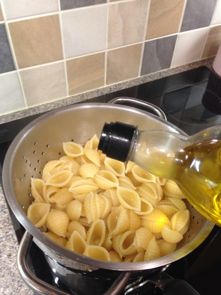 When the pasta is cooked drain it and stir through a drizzle of olive oil. This will stop the pasta getting glued together as it cools. Leave to cool.