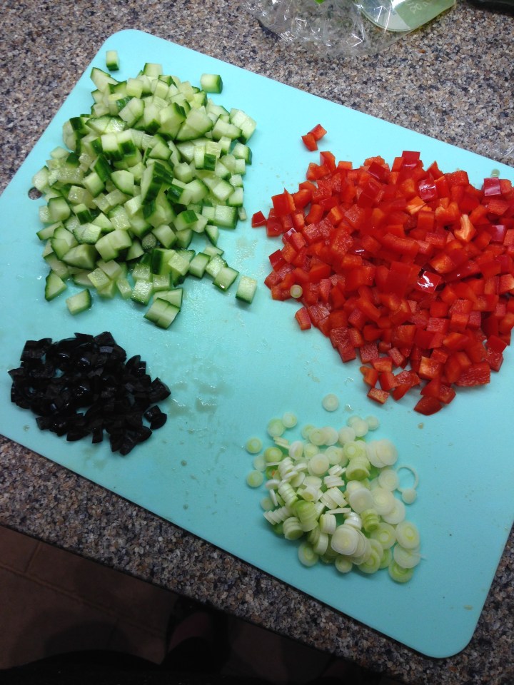 Meanwhile cut the red peppers and cucumber into small cubes, finely slice the spring onions and finely chop the olives